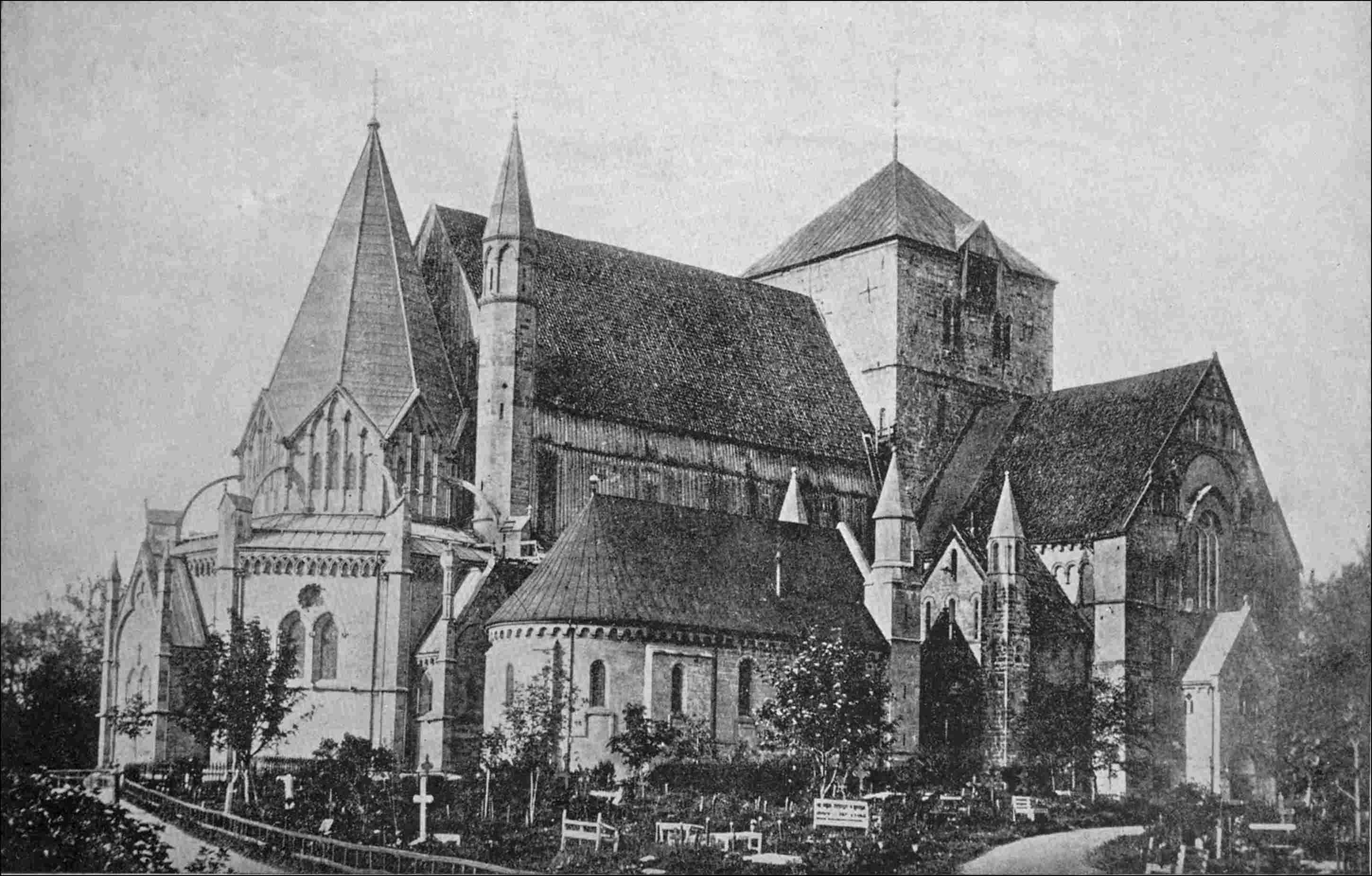 Around the shrine of Olaf in Throndtjem, in which, in spite of Harald Hardrada, his “incorrupt body” was seen more than five hundred years after his death, has arisen the most beautiful of northern cathedrals, originating in a small chapel built over his grave within ten years after his death. The exquisite colour of its green-grey stone adds greatly to the general effect of the interior, and to the delicate sculpture of its interlacing arches. From the ambulatory behind the choir opens a tiny chamber containing the Well of S. Olaf, of rugged yellow stone, with the holes remaining in the pavement through which the dripping water ran away when the buckets were set down. Amongst the many famous bishops of Throndtjem, perhaps the most celebrated has been Anders Arrebo, “the father of Danish poetry” (1587–1637), who wrote the “Hexameron,” an extraordinarily long poem on the Creation, which nobody reads now. The Cathedral is given up to Lutheran worship, but its ancient relics are kindly tended and cared for, and the building is being beautifully restored. Its beautiful Chapter House is lent for English service on Sundays.