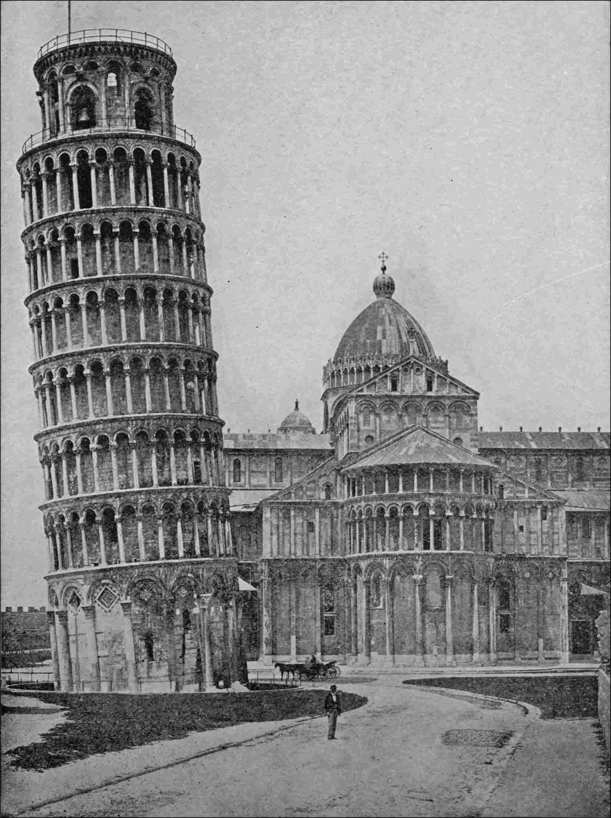 The moon was shining when we approached Pisa, and for a long time we could see, behind the wall, the Leaning Tower, all awry in the uncertain light; the shadowy original of the old pictures in school-books, setting forth “The Wonders of the World.” Like most things connected in their first associations with school-books and school-times, it was too small. I felt it keenly. It was nothing like so high above the wall as I had hoped. It was another of the many deceptions practised by Mr. Harris, Bookseller, at the corner of St. Paul’s Church-yard, London. His Tower was a fiction, but this was reality—and, by comparison, a short reality. Still, it looked very well, and very strange, and was quite as much out of the perpendicular as Harris had represented it to be. The quiet air of Pisa, too; the big guard-house at the gate,299 with only two little soldiers in it; the streets, with scarcely any show of people in them; and the Arno, flowing quaintly through the centre of the town; were excellent. So, I bore no malice in my heart against Mr. Harris (remembering his good intentions), but forgave him before dinner, and went out, full of confidence, to see the Tower next morning.