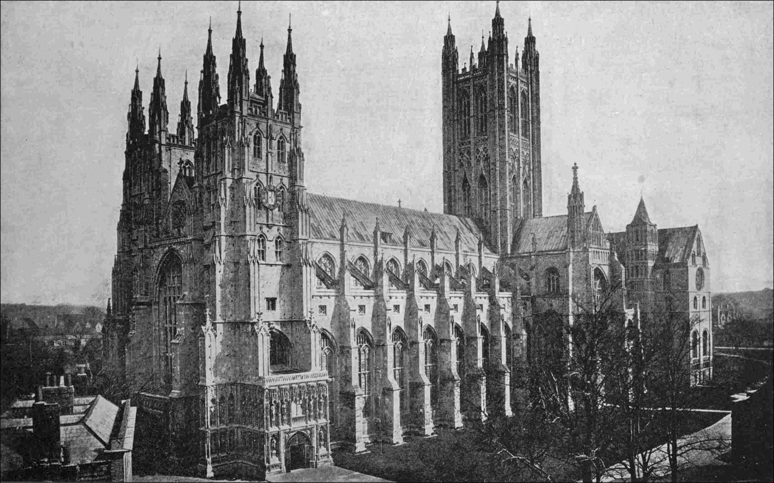 But it is time that we go into the Cathedral precincts. Making use of a canon’s key, we pass, by Queen Bertha’s Postern, through the old city walls, along a piece of the ancient Queningate lane—a reserved space between the walls of the city and the precincts, along which the citizens and troops could pass freely for purposes of defence: through the Bowling Green, where the tower of Prior Chillenden is seen to have been used as a pigeon-house, into the Cathedral Yard. In so doing we pass under a Norman archway of the date of Lanfranc and the Conqueror, which formerly stood in a wall separating the cemetery of the monks from that of the laity; then along303 the south side of the Cathedral, passing Anselm’s chapel, and the beautiful Norman tower attached to the south-eastern transept, with its elaborate tracery, which shows how delicate Norman work could be; past the south porch, over which is a bas-relief of the altar where the sword of Becket’s murderer was preserved; and round, past the western door, into the cloister.