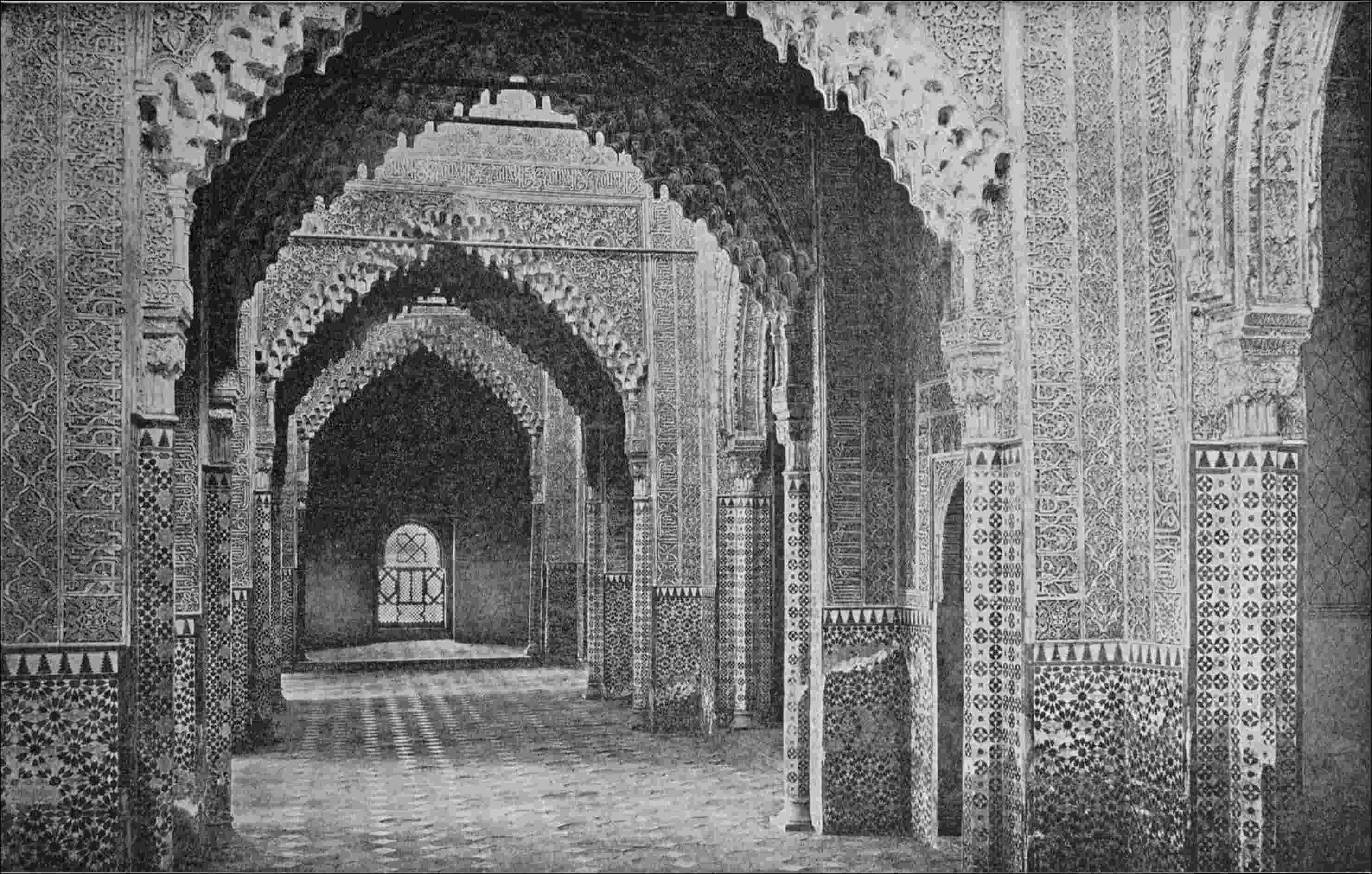Other bands are filled with eulogies to Abu Abd Allah, another Sultan who ordered work upon this part of the Palace. The windows are bedizened with verses in honour of the limpid waters of the reservoir, of the freshness of the shrubbery, and the perfume of the flowers which ornament the Court of the Mezouar, which in fact is seen, from the Hall of the Ambassadors through the doors and little columns of the gallery.