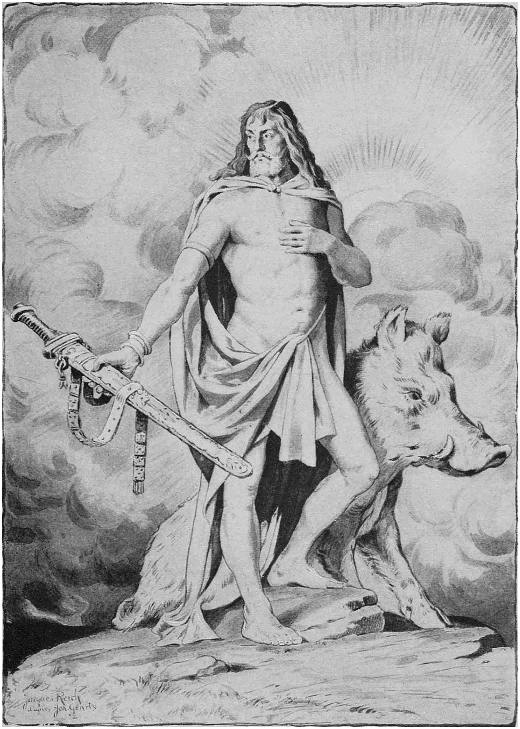 The Northern god of sunshine and summer showers, the genial Frey, has many traits in common with Apollo, for, like him, he is beautiful and young, rides the golden-bristled boar which was the Northern conception of the sunbeams, or drives across the sky in a golden car, which reminds us of Apollo’s glittering chariot.