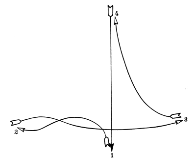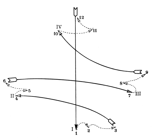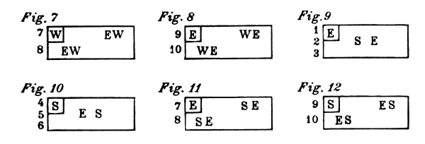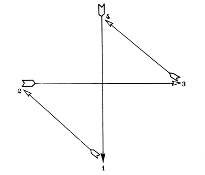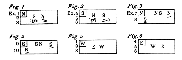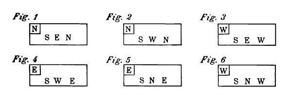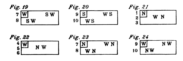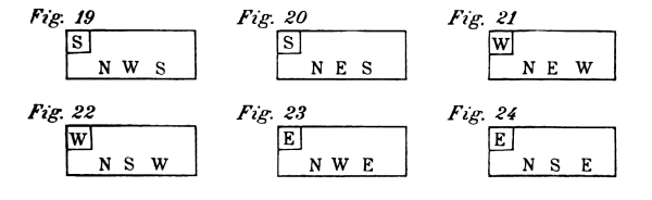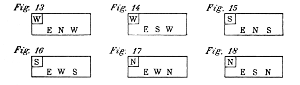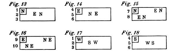 For each style, there are four different positions which, for practical reasons, have been named after the points of the compass; North, South, [Pg 9] East, and West. The drawings contained in this chapter are of the four different positions, for each style of exercise. In the diagram of exercises each of these points is indicated by a letter; N—for North, S—for South, E—for East, and W—for West.