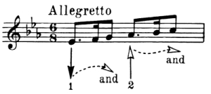 An interesting feature of this early conducting is the fact that all down beats (accented) were indicated by up strokes of the hand and the up beats (unaccented) vice versa, with downward movements. This is just the opposite to modern practice.