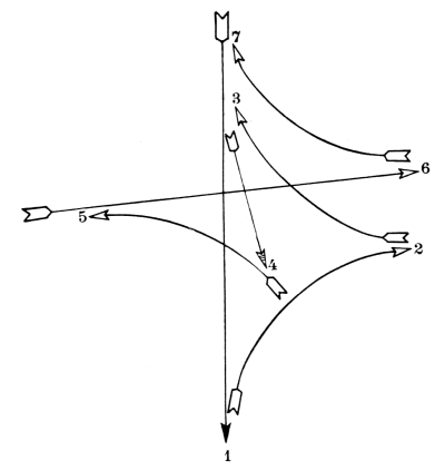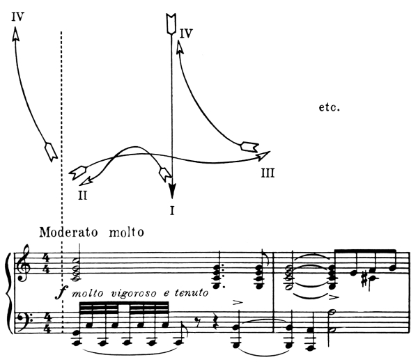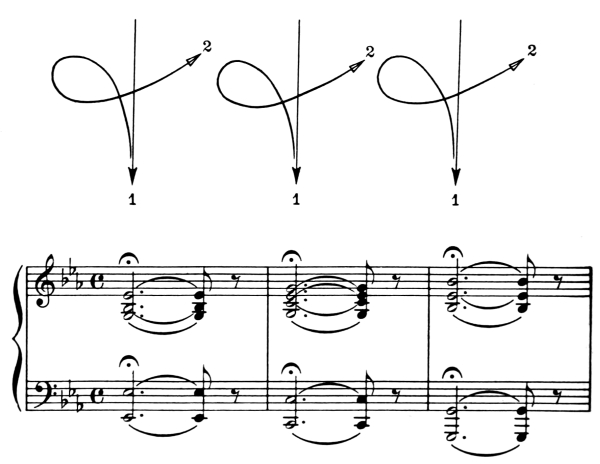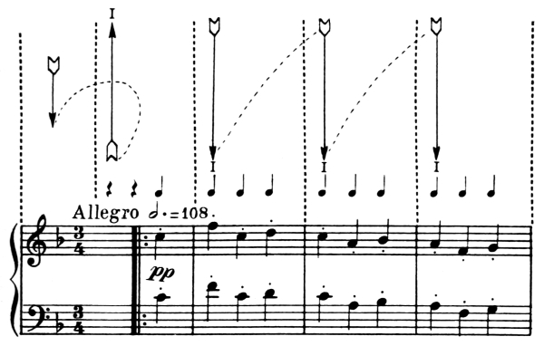 The diagrams on pages 11 and 13 represent a set of exercises for the acquiring of complete control and suppleness of the wrist and arm in all these four movements. On the opposite pages sets of music examples will be found. Each individual note of these examples represents a movement.