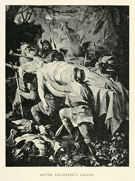 Suddenly, Hagen appeared with a look of triumph on his dark, evil face; and, directly afterwards,-134- many people came running, in wild confusion, carrying torches, and lamenting the hero’s death. And, finally, came the warriors bearing Siegfried upon a great bier.