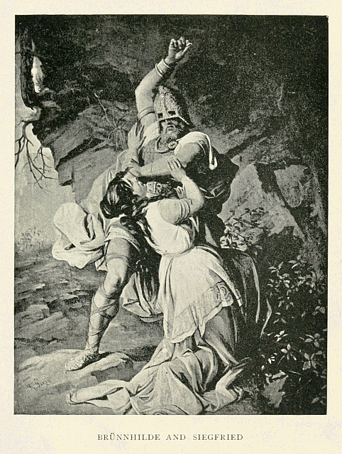 Siegfried, son of Siegmund and Sieglind, woos Kreimhild, the sister of King Gunther, of Burgundy, promising, in return for her hand, to aid Gunther in winning Brunhild, Queen of Issland (Iceland). Siegfried, with the help of his cloud-cloak, conquers Brunhild for Gunther—first in three athletic games, which she makes a test for all suitors; and later when, after the marriage, she proves stormy and untamed. He takes her Ring and girdle, and gives them to his wife, Kreimhild. They possess magic properties, and Brunhild, when deprived of them, loses her great power and becomes like any ordinary woman. She sees her Ring on Kreimhild’s hand one day, and, realizing that it is Siegfried, and not her husband Gunther, who has conquered her great strength and stolen her magic circlets, she tells her wrongs to Hagan, who promises revenge. Hagan is the Knight of Trony, and he and his brother Dankwort are Gunther’s vassals.-xi- Hagan entices Kreimhild to reveal to him the secret of her husband’s safety in battle, and she tells him that Siegfried once slew a dragon and bathed in the blood, which made him invulnerable, save in one place, between his shoulders, where a leaf fell, protecting the skin from the blood. Kreimhild is entirely deceived by Hagan, and, not suspecting his treachery, she sews a circle of silk upon her husband’s vesture over the vulnerable spot, that Hagan may better know how to protect the hero’s one weakness when they are in battle. It is there, where the circle of silk is sewn, that Hagan stabs him.