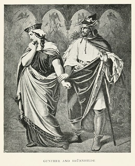 But, as Gunther led his pale, sad bride from the boat, she suddenly stood still, trembling and shuddering, and staring with wild, bewildered eyes at Siegfried. Her voice shook and her face was as white as death as she asked how he came there with Gutrune; and when he showed that he had totally forgotten her and looked upon her only as Gunther’s bride, she staggered and sank into the young hero’s arms, whispering, faintly and sorrowfully: