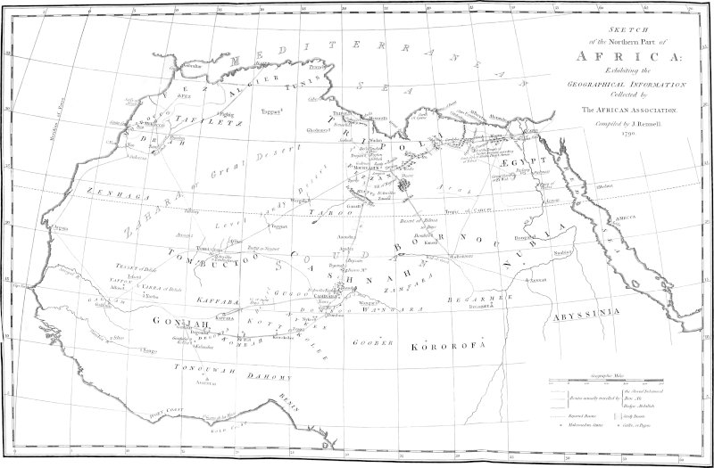 Mr. Beaufoy having given, from the materials in his possession, so full an account of each road and country, nothing remains[220] for me to do, but simply to describe, from the same materials, the mode of fixing the principal positions, in the Map. As the object of it is to exhibit the new matter only, care has been taken to exclude all that has already appeared, except what was absolutely necessary towards explaining the other: and as the borrowed particulars are distinguished from the rest, the Reader cannot be mistaken. The outline of the great body of Africa, together with the courses of the Nile, Gambia, Senegal, and Wad-drah, are copied from Mr. D’Anville.