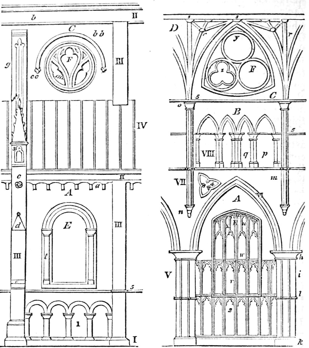 In semi-Norman and early English architecture, the abacus of engaged shafts is frequently returned along the walls, in a continued horizontal string: perhaps the last lingering recognition of the effect of the capital in representing that horizontal line, which was so decided in the classic architrave, and to which the spirit of Gothic architecture is in the main so greatly opposed.