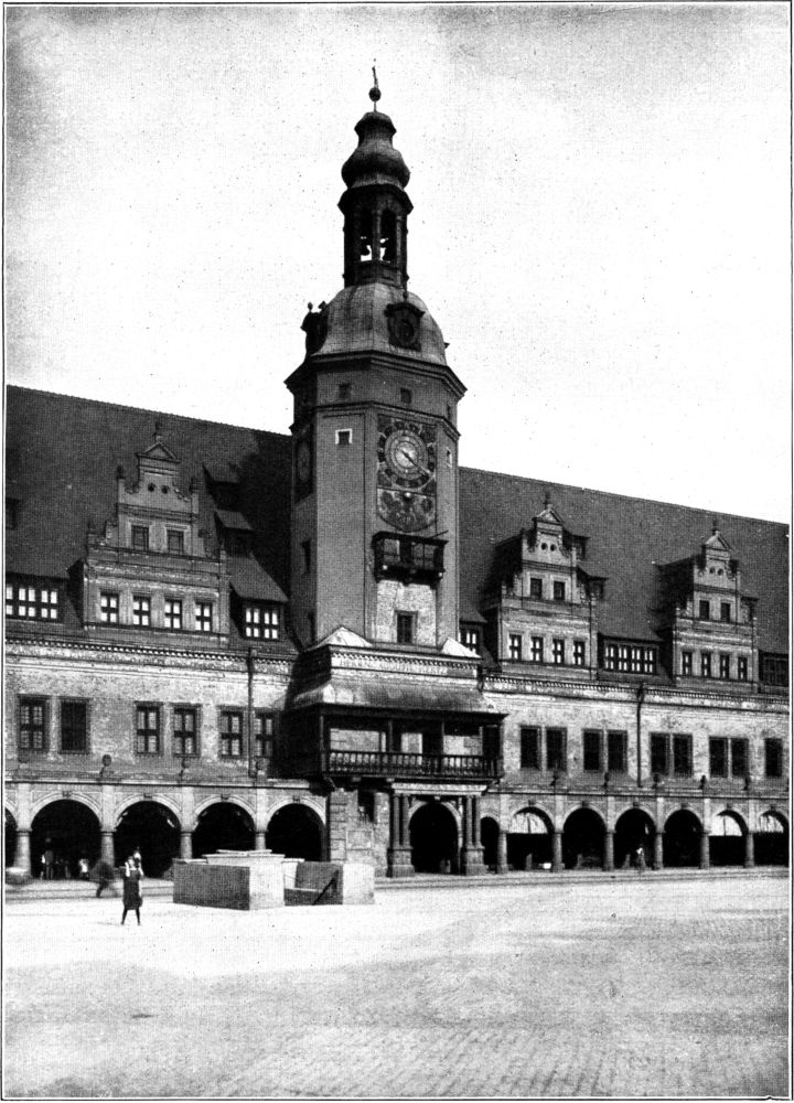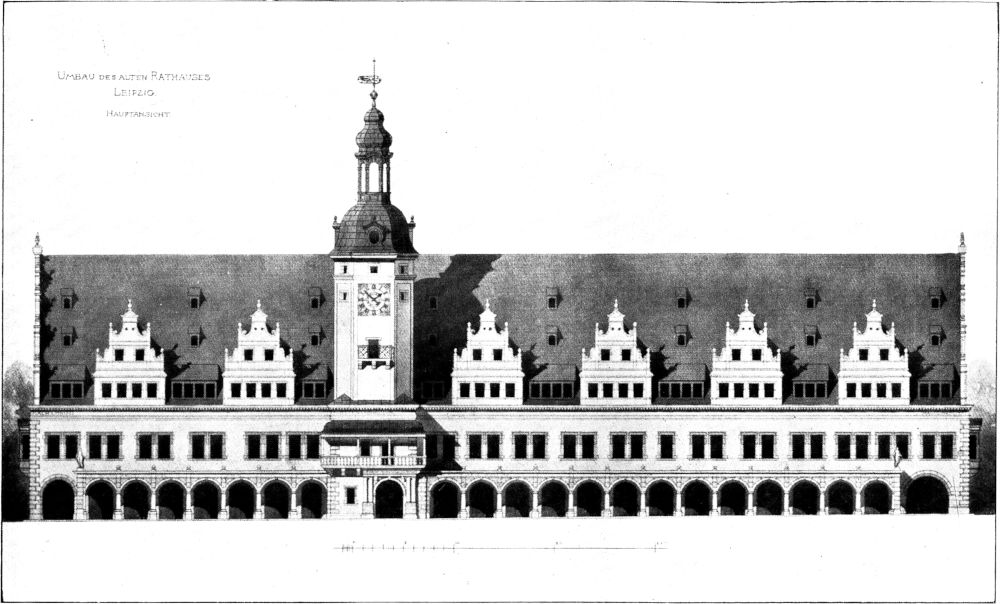 Unter den alten Rathäusern Sachsens ist, wenn man die heutige Grenze als maßgebend ansieht, zweifellos das alte Leipziger Rathaus der bedeutendste und schönste Bau. Bedeutsam, weil er der rechte Vertreter der sächsischen Rathäuser seiner Zeit ist. Typisch die Folge der aufgereihten hohen Dachaufbauten und der mittlere vorgestellte Treppenturm. Und schön muß der Bau genannt werden, weil er bei aller malerischen Freiheit dennoch das schöne Gleichmaß zeigt, weil er, ohne seine Umgebung zu ertöten, dennoch kaum schöner an seinen Platz am Markt hätte gestellt werden können. Das alte Rathaus wurde 1556 von Hieronymus Lotter gebaut. Es entstand in einer Epoche, die in Obersachsen eine Blütezeit für alle Künste und nicht zum wenigsten für die Baukunst war. Hier, wo die Wiege der Reformation stand, war fruchtbarer Boden für die Kunstpflege. Die Reformation gab dem künstlerischen Schaffen, besonders im Kirchenbau, Freiheit und der »nervus rerum« floß reichlich aus dem Bergsegen des Landes, an dem nicht nur der Fürst, sondern in hohem Maße auch alle Städte beteiligt waren. So war für das städtische Bauwesen gute Zeit.