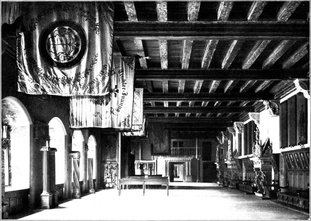 Es war ein überaus glücklicher Gedanke, das alte Rathaus als stadtgeschichtliches Museum umzubauen. Der größte Teil des Gebäudeinnern war zu Verwaltungsräumen ausgebaut. Trotzdem haben sich eine Anzahl schöner Architekturstücke erhalten, so vor allem der vortreffliche Renaissance-Kamin von 1610 (Abb. 5) und der Pfeiferstuhl, der wohl noch von 1556 stammt und die Handschrift Wiedemanns zeigt. Diese Musikempore erinnert daran, daß der Rathaussaal der Saal der Stadt war. Hier fanden die Bürgerversammlungen statt, hier wurden die Ratsschmäuse abgehalten, hier feierten die angesehenen Bürger ihre Hochzeitsfeste und hier war auch der öffentliche Tanzboden. Der Umbau von 1906/09 hat mit großem Verständnis die Räume wieder in ihren ursprünglichen Zustand gebracht. Man bekommt so recht ein anschauliches[252] Bild, wie weiträumig und großzügig unsere Altvordern bauten. Wie schön der große Bürgersaal sich als repräsentative Diele des Rathauses zeigt, kann das beigefügte Bild am besten zeigen. (Abb. 6.)