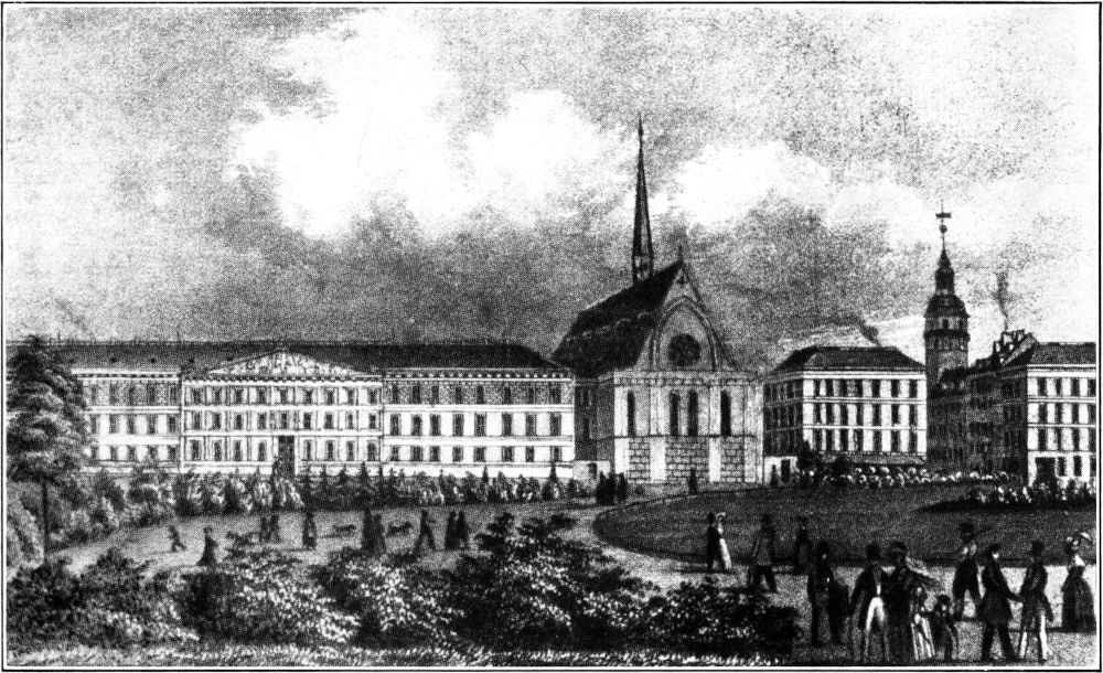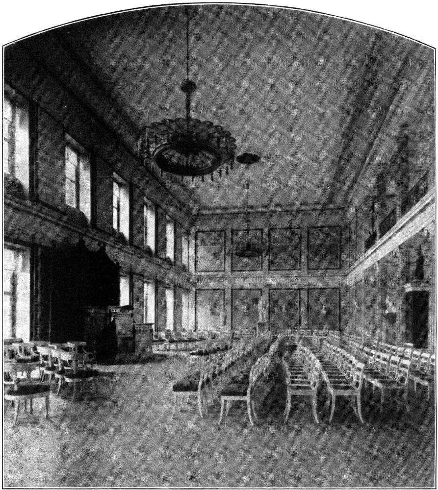 Die Gestaltung des Augustusplatzes begann in den dreißiger Jahren bereits mit den Bauten der Universität und des Postgebäudes. Mit beiden ist der Name Geutebrücks eng verbunden. In den Jahren 1836 und 1838 hatte Geutebrück mit dem Augusteum und der Post die ersten Seitenlinien dieses großen Platzes ziehen können und damit den Mittelpunkt der baulich sich entfaltenden Stadt angelegt. Wenn auch für die Ausführung der Fassade des Augusteums ein Entwurf Schinkels maßgebend wurde, so hatte doch Geutebrück[280] nach eigenen Plänen den Innenbau durchführen können und sich dabei als Universitätsbaumeister großes Verdienst erworben. Seine Ausgestaltung der Aula, die später umgebaut wurde, verdient als vorbildlicher Saalbau seiner Zeit im Bilde wiedergegeben zu werden.