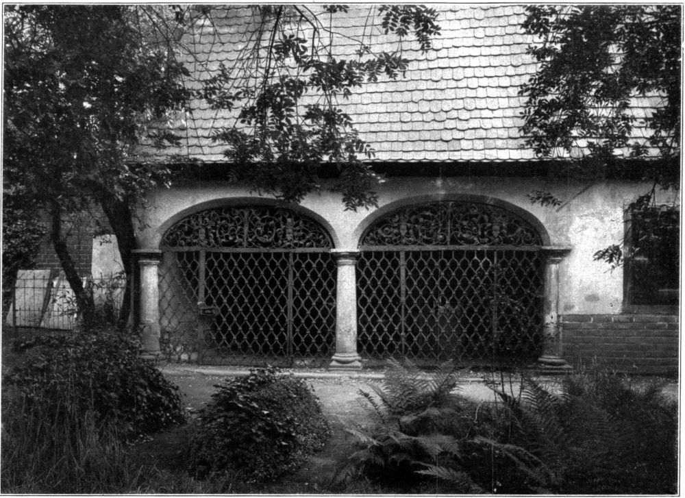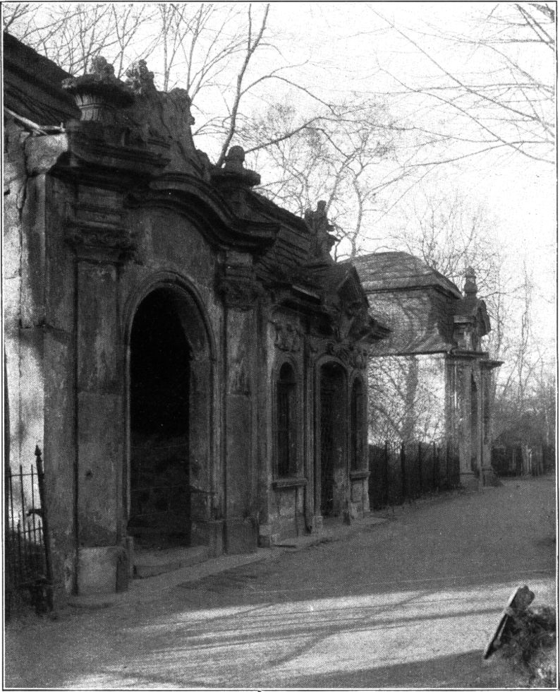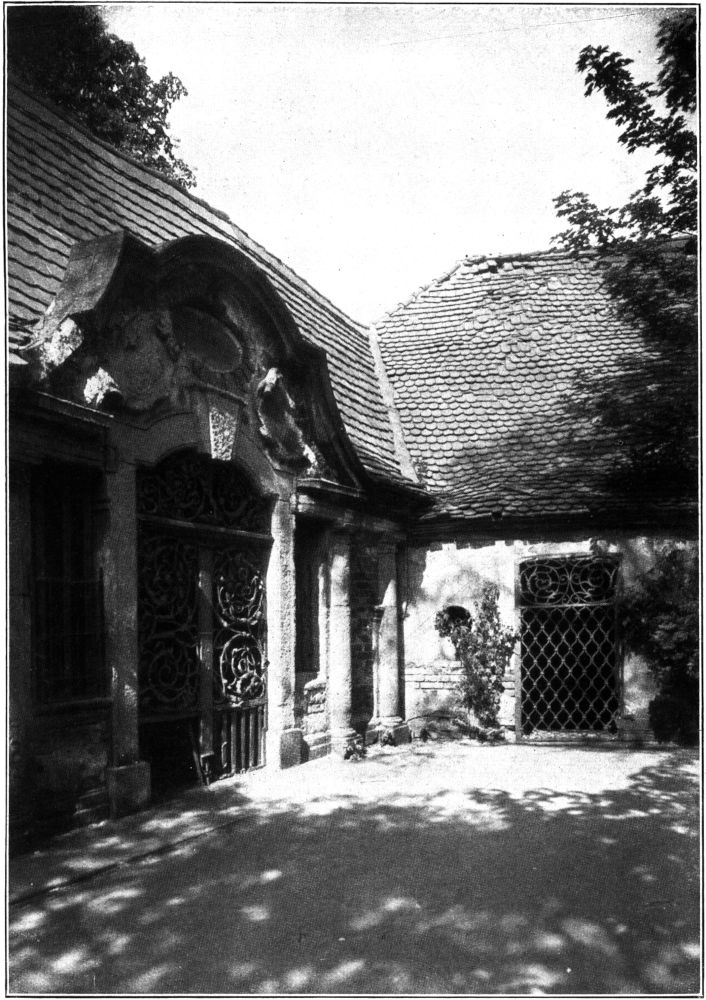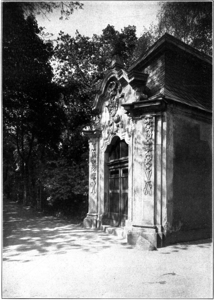 Am Eingange zum heutigen Friedhof ist die Gruft der Familie Baumgärtner als Pavillonbau errichtet, die in Umriß und Detail ganz den barocken Geist ihrer Entstehungszeit um 1720 atmet. (Abb. 4.) Wohl das schönste schmiedeeiserne Ziergitter der Barockzeit ist an der Eingangstür zur Löhrschen Gruft erhalten, die um 1740 erbaut wurde und in ihren reichen Architekturmotiven schon den Geist des Rokoko charakterisiert. (Abb. 5.) In der klassizistischen Zeit werden die Formen einfacher. Die Friedhofsmauer erhält meist nur eine Inschriftstafel oder eine Nische mit plastischem[295] Schmuck, wie beispielsweise die Grüfte der Familien Storch und Meißner um 1790 und Weinhold und Sixdorf um 1804.