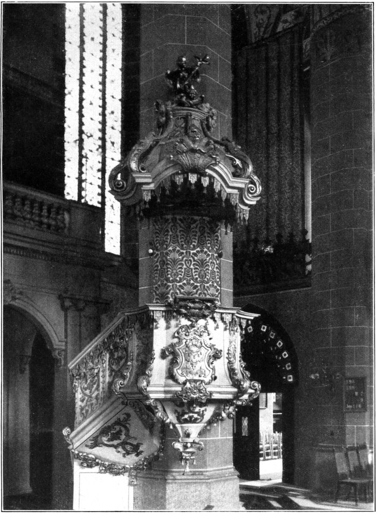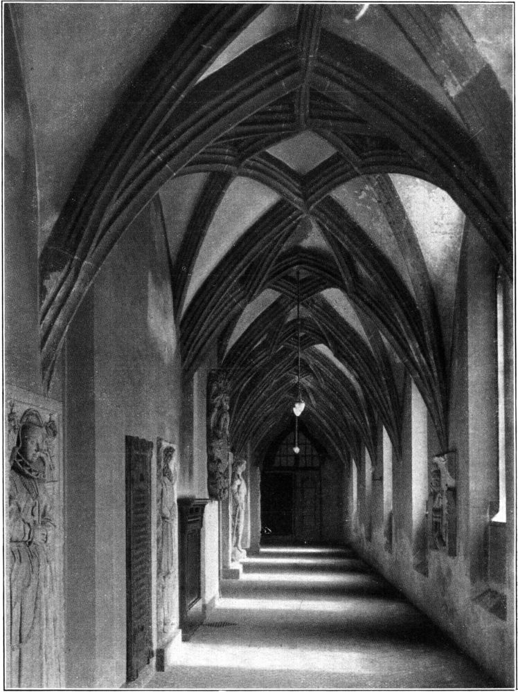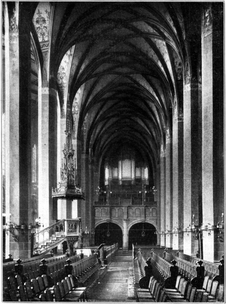 Die Paulinerkirche, die mitsamt dem umfangreichen Gebäudekomplex des dazugehörigen Klosters nach dessen Säkularisation 1543 an die Universität kam und seitdem als Universitätskirche dient, hat ihren letzten Umbau zusammen mit dem Neubau der Universitätsgebäude in den neunziger Jahren des[311] vergangenen Jahrhunderts durchgemacht. Sie ist dabei im Inneren ihrem allgemeinen Charakter nach eine spätgotische Hallenkirche von etwas kleineren Dimensionen mit drei Schiffen und einem dreigeteilten Chor geblieben. Auch die Einzelformen, die sie durch die zwei letzten Bauperioden der Dominikaner erhalten hatte (um 1485 und 1520), sind im allgemeinen erhalten worden. Für die Beleuchtungsverhältnisse und die Raumwirkung des Langhauses ist es von[312] Bedeutung, daß, wahrscheinlich im sechzehnten Jahrhundert, das obere Stockwerk über dem an die Südwand der Kirche anstoßenden Kreuzgangflügel als Erweiterung der rechten Empore in den Kirchenraum einbezogen worden ist. Die Emporen, die das Schiff auf drei Seiten umrahmen, stammen in ihrer heutigen Gestalt aus dem Beginn des achtzehnten Jahrhunderts, die prachtvolle geschnitzte Kanzel in frühem Rokoko aus dem Jahre 1738.