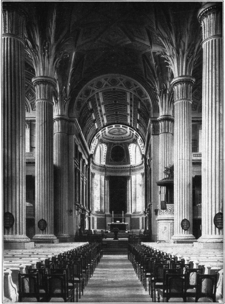 In Leipzig setzte frühzeitig die Bewegung des Klassizismus ein. Hier hatte bereits der Zopfstil, der Vorläufer der klassizistischen Periode, in Adam Friedrich Oeser, dem Maler und Lehrer Goethes, seinen Hauptvertreter. Der praktische Vertreter des Klassizismus wurde nach ihm der Architekt Johann Friedrich Dauthe, der in seinen Bauten dem Zuge der Zeit zur Antike einen starken Ausdruck zu geben verstand. Als eines seiner besten Werke kann noch heute die Innenarchitektur der Nikolaikirche gelten, deren ehemals gotischen Stil Dauthe in eine mustergültige naturalistische Form des Klassizismus brachte. Ein weiterer Bau dieses Architekten, die Frauenberufsschule auf der alten Moritzbastei, hat im vorausgehenden Artikel eine ausführliche Darlegung gefunden. Der Architekt von heute wird bei einem näheren Studium[279] der schlichten Fassade viel schöne Einzelheiten und feine Gedanken klassizistischen Empfindens wiederfinden.