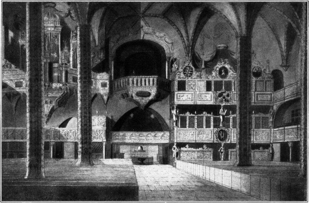 Das achtjochige Langhaus ist nach einem einheitlichen Plane von 1483 bis 1496 dem eigentümlich verkümmerten Querschiff und dem niedrigen einschiffigen[308] Chor aus einer etwa siebzig Jahre früheren Bauperiode vorgelegt worden, die gegen das Langhaus schief orientiert sind. Dieser ältere Bauteil wirkt als eine dunkle Masse, da er sein Licht nur durch die nicht besonders hohen, heute zudem mit dunklen Glasbildern versehenen Fenster im fünfeckigen Chorabschluß erhält. Von dem Aussehen der Kirche in katholischer Zeit werden wir uns heute schwerlich mehr ein Bild machen können, da von ihrer inneren Ausstattung, wie auch von der Ausschmückung der Kapellen, die an die Seitenschiffe anschließend, noch bis zur Zeit des letzten Umbaus standen, das Meiste längst verloren ist. Im siebzehnten und achtzehnten Jahrhundert hatten sich über den Emporen und sogar über dem Triumphbogen vor dem Chore balkonartige Logen von den verschiedensten Formen eingenistet, die ein sehr malerisches Bild geboten haben müssen, allerdings zum Teil die Seitenschiffenster verdeckt haben werden. Die moderne puristische Restauration hat damit aufgeräumt. Dadurch ist eine gewisse freudlose Nüchternheit in die alte Kirche eingezogen – bekanntlich das Schicksal vieler alter Kirchen in protestantischen Gegenden. Die prächtigste Loge, der 1683 zur Erinnerung an die Türkensiege Kurfürst Johann Georg III. über der linken Seitenempore aufgebaute »Fürstenstuhl« ist sogar noch 1889 abgebrochen worden, »weil er in den Stil der Renovation nicht paßte.« Er konnte aber später wenigstens Aufnahme im Stadtgeschichtlichen Museum finden.