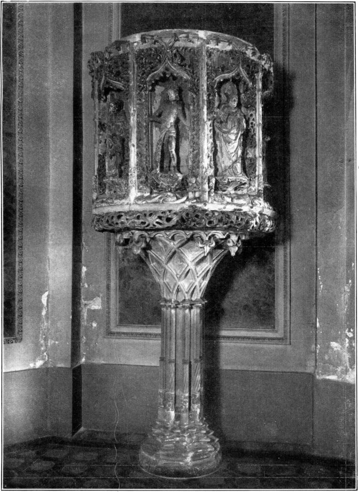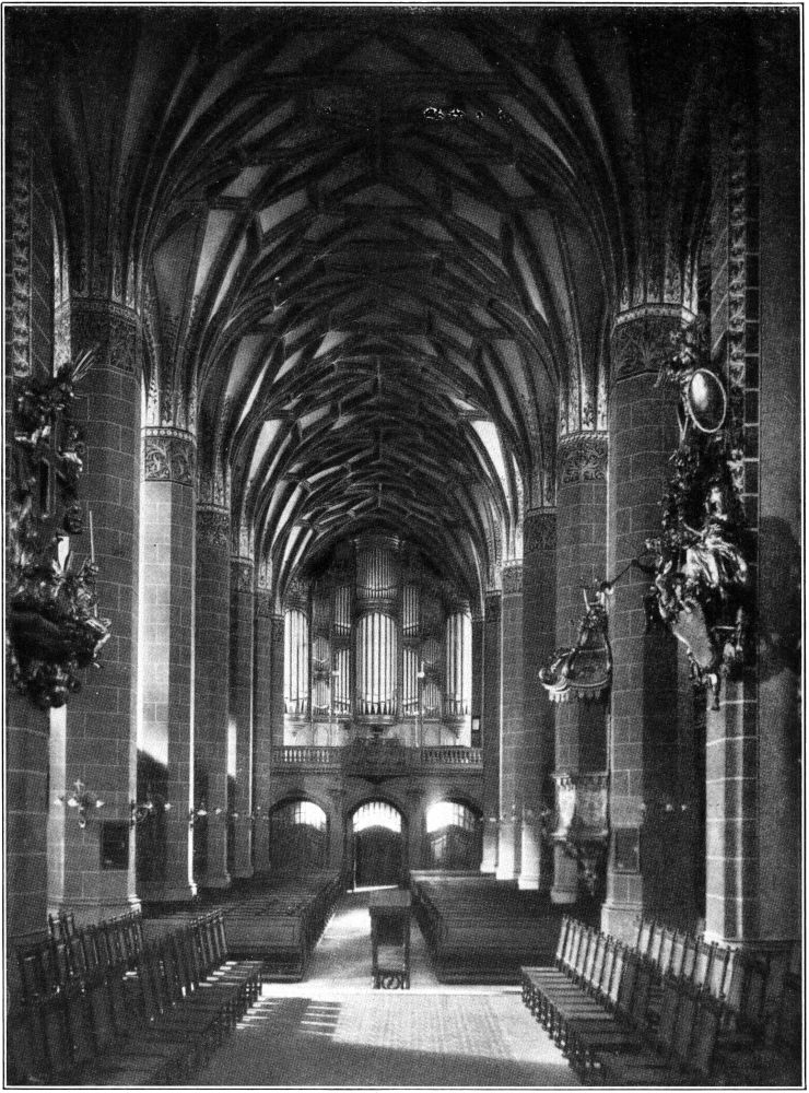 Der Thomaskirche, deren unvergänglicher Ruhm es geworden ist, daß Johann Sebastian Bachs unsterbliche Werke zum ersten Male in ihr erklungen sind, und die noch heute die große, fast vierhundertjährige Tradition der protestantischen Kirchenmusik in vorbildlicher Weise pflegt, hat die letzte Restauration[305] in der schlimmsten Epoche deutscher Baugeschichte (um 1880) im Inneren die imponierende Raumwirkung nicht rauben können, obwohl aus dieser Zeit die Bemalung stammt, die ihrer Würde so ganz und gar nicht entspricht. Sie präsentiert sich beim Eintritt durch das ganz moderne Westportal und ebenso vom Chore aus mit ihren drei gleichhohen Schiffen, deren Gewölbe von schlanken aufstrebenden Achteckspfeilern getragen werden, als eine helle[307] geräumige Halle von vornehmen ruhigen Proportionen, und die an drei Seiten umlaufenden, bis annähernd in Drittelhöhe heraufreichenden Emporen, die man gegen Ende des sechzehnten Jahrhunderts eingebaut hat, würden diesen Eindruck viel weniger stören, wenn sie nicht durch den auffallenden, wenig erbauenden Bilderschmuck, den sie vor einigen Jahrzehnten erhalten haben, noch besonders hervorgehoben würden.