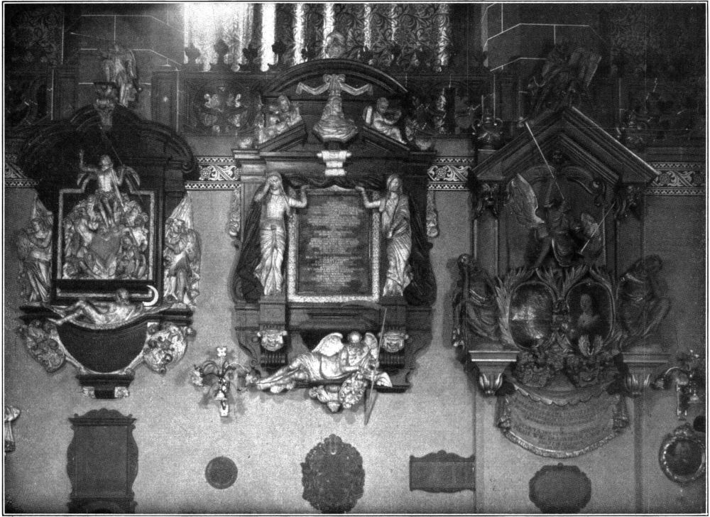 Vor der Reformation war der Chor durch einen schlicht gehaltenen gotischen Lettner abgeschlossen, wurde aber bei Einrichtung der Kirche für den protestantischen Kultus gegen das Langhaus zu geöffnet. Damals ist auch der[315] gerade erst wenige Jahrzehnte zuvor auf den Zwinger der Stadtmauer herausgeschobene Chorabschluß beseitigt und durch eine einfache Wand mit einem großen Fenster ersetzt worden. Die an die linke Seitenschiffwand angebauten Kapellen sind zu Beginn des neunzehnten Jahrhunderts abgetragen worden,[316] und die zahlreichen Epitaphien von Angehörigen der Universität, sowie einige Denkmäler aus der Periode der Dominikaner hat man darauf zum Teil im Kreuzgange aufgestellt, zum Teil aber, so gut es ging, an den hohen Schranken[317] angebracht, die den Hauptchor von den Nebenchören trennen. Dort bieten sie sich aber, in enger Folge aneinandergedrängt, dem Beschauer nicht allzu günstig dar. Das ist um so bedauerlicher, als sich unter ihnen hervorragende Werke aus fünf Jahrhunderten befinden, die mehr als lokales Interesse beanspruchen dürfen, angefangen von der buntbemalten hölzernen Statue des 1307 in[318] Leipzig ermordeten Markgrafen Dietzmann, die mit dem heute vor dem rechten Nebenchor aufgestellten Sitzbild des heiligen Dominikus der bedeutendste Zeuge des hohen Standes der Leipziger Plastik im vierzehnten Jahrhundert ist. Aus den folgenden Jahrhunderten stammen schöne bronzene Grabplatten[320] und Epitaphien in den strengen Formen der Renaissance und daneben in den kühnen, gewaltig bewegten des Barock. Der große Wandelaltar aus dem Beginn des sechzehnten Jahrhunderts ist neuerdings sorgfältig restauriert und ergänzt worden, und sein geschnitzter Hauptteil hat auf dem Altarplatz im Chor seine Stelle gefunden, während man die gemalten Flügel im Nordchor untergebracht hat.