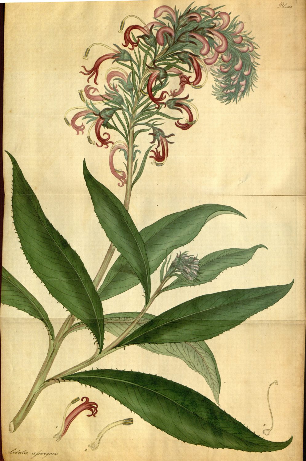 This curious species of Lobelia is a native of high mountains in Jamaica, where Brown informs us it grows to the height of 5 or 6 feet. The plant is at present so scarce as not to be enumerated in the Catalogue of the Cambridge Garden; nor has any figure of it, to our knowledge, been before published. Specimens were communicated by A. B. Lambert, esq. from his stove at Boyton, where he informs us that the plant is now about five feet high, with some of the lower leaves a foot and a half long; that it began to blossom in the middle of July, and continued to the end of November; four or five racemes flowering at the same time, and nodding in the manner of ostrich plumes; the blossoms gradually opening in succession towards the top, and the racemes continuing to lengthen until more than a foot long. The flowers have withered without producing any seed. The plant appears to be perennial.