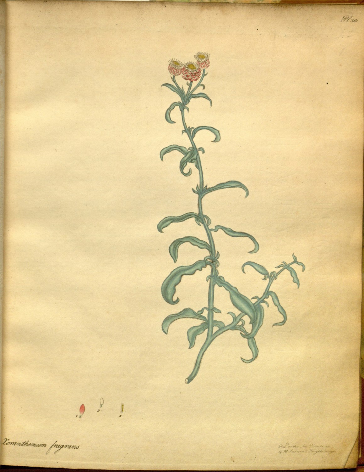 This little Xeranthemum is a native of the Cape, perfectly new, and very sweet-scented. As fragrance is very unusual in this fine tribe of plants, we have on that account considered it as a good specific title. It was introduced to the Clapham gardens about the year 1803; and as we have not seen it since that period, we are inclined to think it is not at present in this country. In the herbarium of A. B. Lambert, esq. we found a fine native specimen of an unnamed species very much resembling our plant, but with a profusion of flowers—a habit which ours would in all probability have assumed as soon as it had been familiarized to the change of climate.
