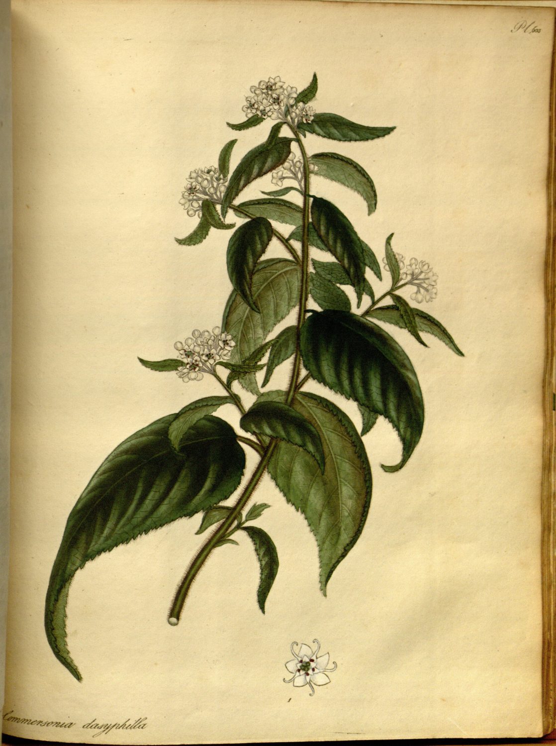 Commersonia dasyphylla is a low branching shrub, a native of New Holland or Van Diemen’s Land, and is remarkable for a powerful odour of cucumbers which it emits when in blossom, and even retains for some time after it is dried. Being a plant which blossoms freely in early spring, and of very easy culture, it well deserves a place in the green-house or conservatory. Only one species of Commersonia has before flowered in England, the C. echinata of our last volume (Plate 519), but which has since been discovered to be a different species from the original C. echinata of Forster; which error we take the present opportunity of correcting, and beg of our readers to erase the name echinata in our 519th plate and description, and substitute platyphylla, with the following specific description: