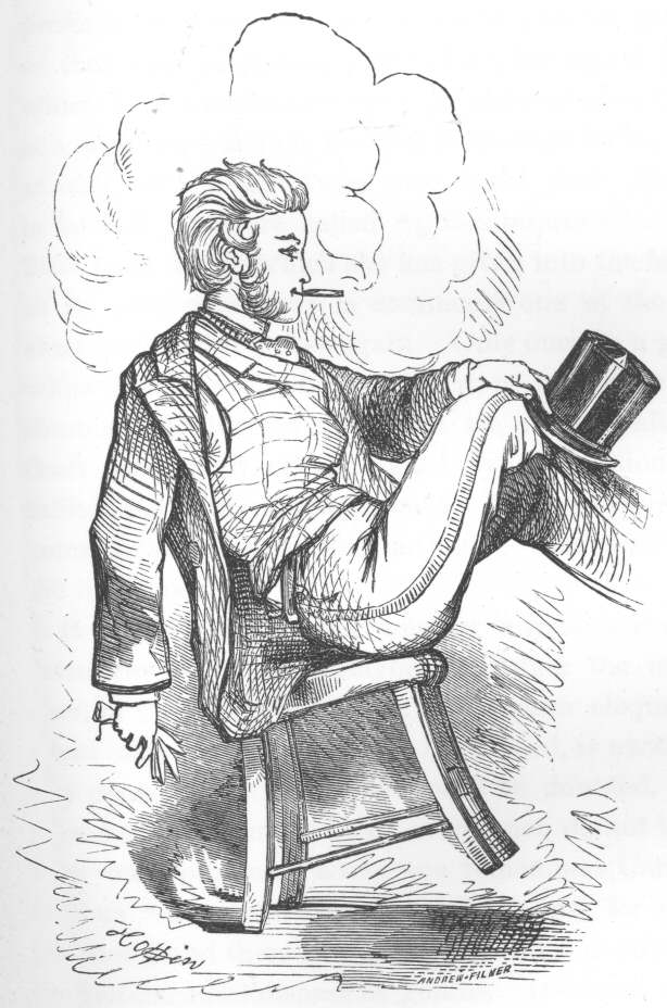 My laughing and winking young friend undertook to procure and arrange the flowers for the table, and did it with immense zeal. I never saw him look happier than when he came in, his hat saucily on one side, and a cheroot in his mouth, with a huge bunch of tea-roses, which he said were for “Madam.”