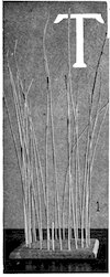 The decorative initial at the beginning of this chapter shows the adaptation of decorative weavers in making a small demijohn. Its foundation is a quart Vichy bottle. The weavers used can 40be easily seen, also the proportionate spacing of bands. The handles are twisted just as on a basket. Stakes and handle foundations are of No. 4 and the weavers of No. 2.