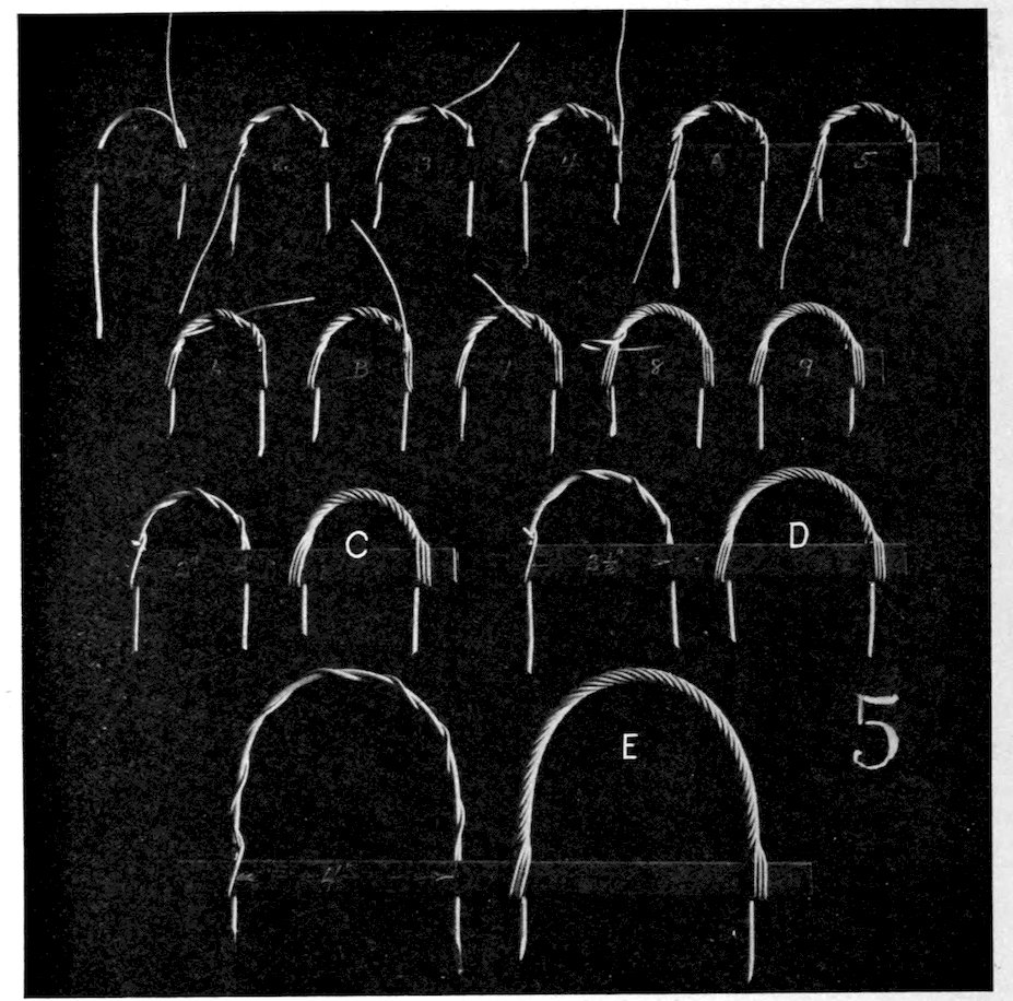The weavers next go through stages B and C as follows: The upper one is brought diagonally down across the horizontal group of eight and to the left behind the vertical group; the lower one diagonally up, across the face of the vertical group of eight, then down behind the horizontal group and to the left across the face of the vertical group to the position shown at C. The pairing weave now commences around the groups of eight until two rows have been woven, when they separate into groups of fours, and the weaving continues three times around before separating into pairs. 29It will be found necessary to weave around the pairs four or five times before separating into singles. D shows the separation into fours and the beginning of the separation into pairs. The singles should be sufficiently far apart after five or six rows have been woven around them to allow the triple weaving to be commenced.