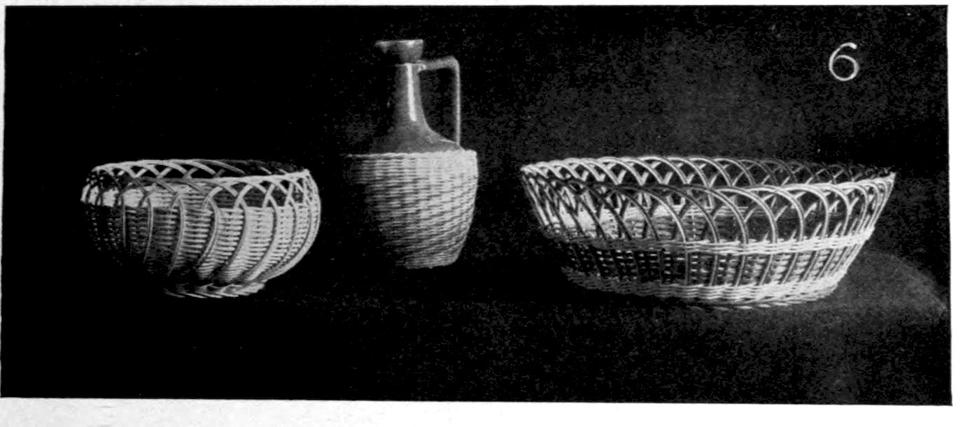 Figure 6 shows a small jug covered with weaving part way up. This was selected for its outline and covered, because it had a large “trade mark” glazed upon its surface. The baskets shown in Figure 6 will be described later.