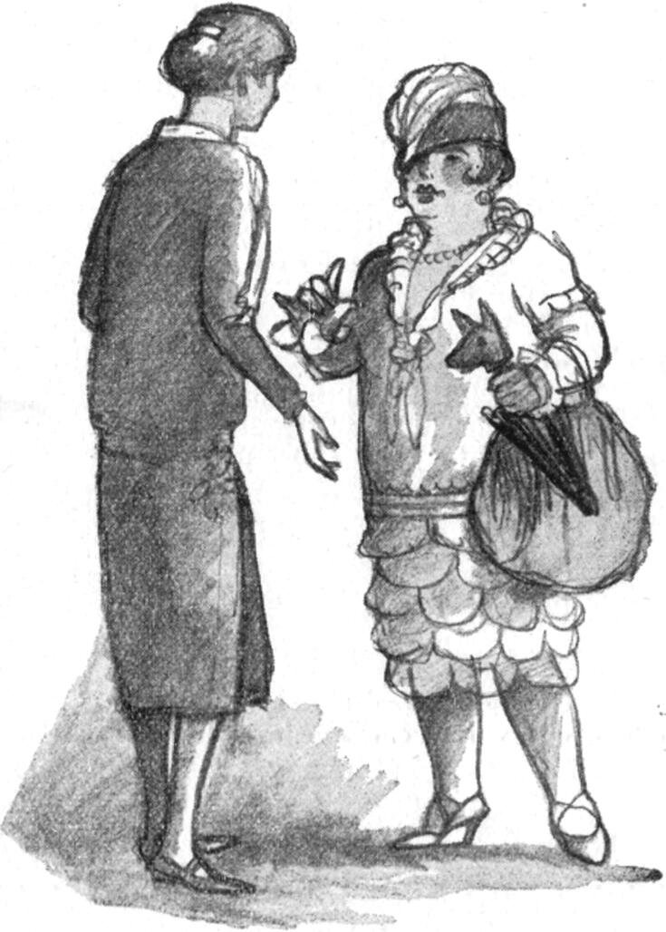 Mi ez? Álarcosbálról ruccant volna ide ez a rejtélyes kis donna, a duennájával? Szeptember még nem a bálok hónapja. Talán valami attrakció, mellyel a Butik tulajdonosa kedveskedik a publikumának? Táncosnők lesznek, alighanem mindjárt kiállanak majd a parkettre. Hanem a tulajdonos is tétován néz feléjük a sarokból és a két tenyerével adja a zászlójeleket erre-arra, hogy fogalma sincsen…