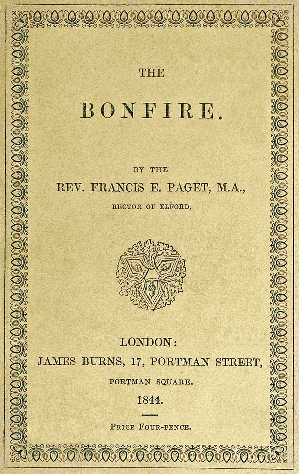 It was a custom in Yateshull, as I believe it is in most country-places, that the school-children should have a half-holyday on the Fifth of November, and be allowed to make a Bonfire as soon as it was dusk.—The half-holyday was given in order to allow the children time to pick sticks in our Squire’s park, or to beg a few faggots of the farmers; but I am sorry to say, that instead of giving themselves the trouble to do this, the boys sometimes broke the hedges. This made the farmers very angry, and they would give no more faggots, and so the boys were puzzled where to find wood for burning: indeed one year they could get nothing but a parcel of wet straw from an old thatch, which only made a thick choking smoke, and would not burn up at all.