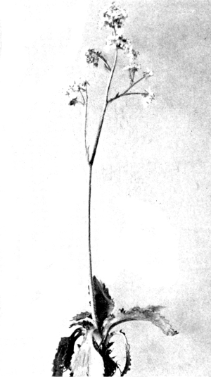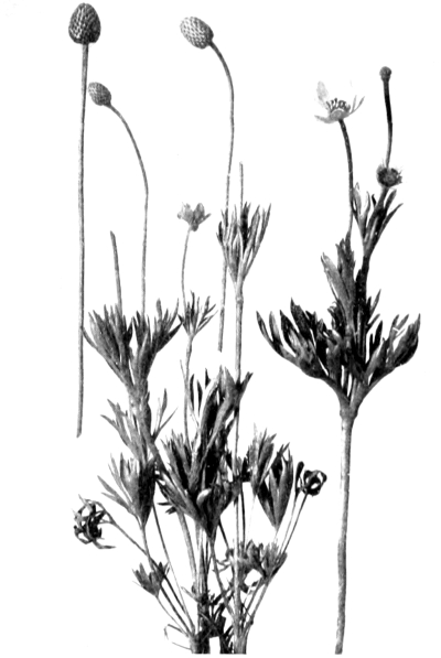 Scape slender and scaly, 6—24 inches high. Leaves nearly orbicular in outline, 3—12 inches broad, deeply 7—11-cleft to much beyond the middle, green and smooth above, densely white-woolly beneath, at least when young; the lobes oblong to obovate-acute, often somewhat wedge-shaped, sharply dentate or cut. Heads mostly diœcious, numerous, [Pg 313] corymbose, ⅓—½ an inch broad; flowers usually white, fragrant, the marginal ones of the pistillate heads with narrow pinkish or white rays about ¼ of an inch long; cottony in fruit.