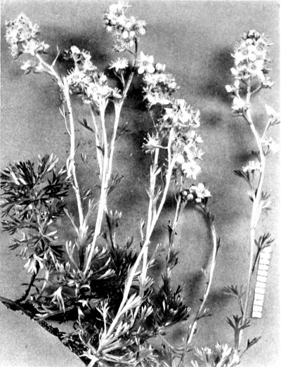 Woolly throughout; stems simple, 6 inches to 2 feet high. Leaves narrowly oblong in outline, bi-pinnately dissected into numerous small linear divisions. Heads numerous, crowded into a rather contracted cyme; [Pg 315] involucre oblong, nearly ¼ of an inch high; bracts lanceolate, green with brown translucent borders; rays 4—5, white, broadly obovate, notched and spreading, about the length of the involucre.