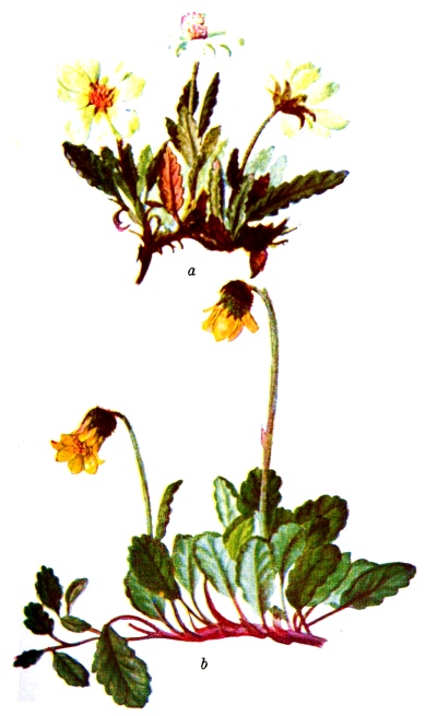 Permanently silvery-hairy with felted hairs; stems several, 6—12 inches high from a woody base. Leaves sometimes all undivided, the radicle and lower from spatulate to oblong or roundish-oval, ½—1½ inches long, slender-petioled, sometimes laciniate-toothed, or pinnatifid. Heads of flowers few and terminal, ⅓ to nearly half an inch high; rays yellow, nearly ½ an inch long. [Pg 311]