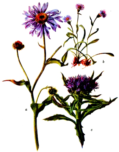 Slightly hairy or smooth, simple or somewhat branched, 18 inches to 2 feet high, bright green. Leaves thin, ovate-oblong to broadly lanceolate, 2—4 inches long, loosely veined, tapering at the apex into a slender-spined tip, the larger sometimes with a few small acute teeth. Heads ½ an inch high, hemispherical, either racemosely disposed on slender axillary peduncles, or somewhat cymose; involucral bracts mostly acute or acuminate, some outer ones loose, narrow, and partly herbaceous, or with loose pointed tips; inner purplish; rays about ½ an inch long, spreading, violet or pinkish.