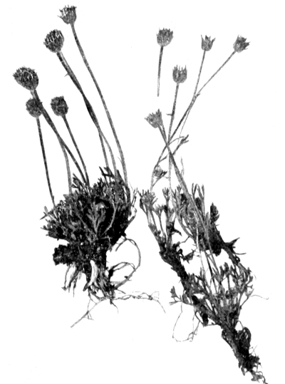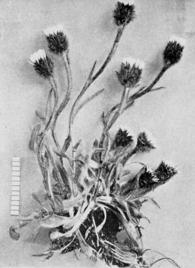 More or less woolly; stem 6—10 inches high. Leaves rather thin, the lower spatulate, acute, 1—2 inches long, green above, woolly beneath; stem leaves lanceolate, clasping, 1 inch long, becoming smaller toward [Pg 319] the summit. Heads in a compact capitate cluster, ½ an inch or more in diameter, woolly at the base; involucral bracts very narrow, acute, thin, and translucent, straw-colour, the outer ones densely woolly and occasionally rosy.
