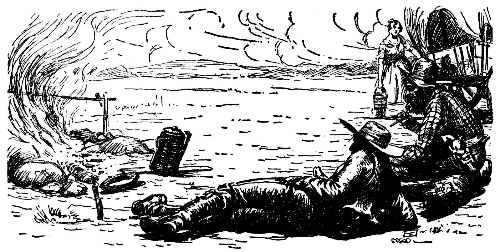 The fires veered and danced in the late twilight; a fog sank over the treetops, bringing with it a clammy touch. For the most part the people had finished with their supper and were now lying around, spinning yarns and weaving dreams. It was a time for babies to be cooing in the wagons, half asleep; for the younger boys and girls to be out among the shadows playing hide and seek. One darted up to Budd and used the storekeeper’s vast bulk for a momentary refuge. A guitar strummed and a couple intoned a song about “Sweet Genevieve.” It struck directly to the hearts of all the middle-aged in that particular circle and voices died away. Budd moved on with a feeling of compassion. These were his people, his kind of men and women. Then he saw Bill squatting, Indian fashion, before a solitary little blaze.