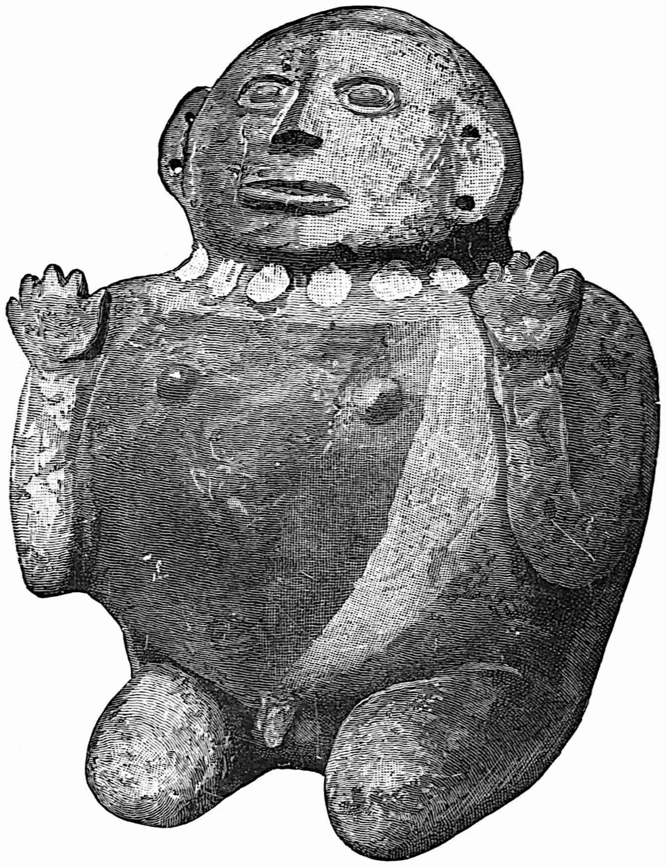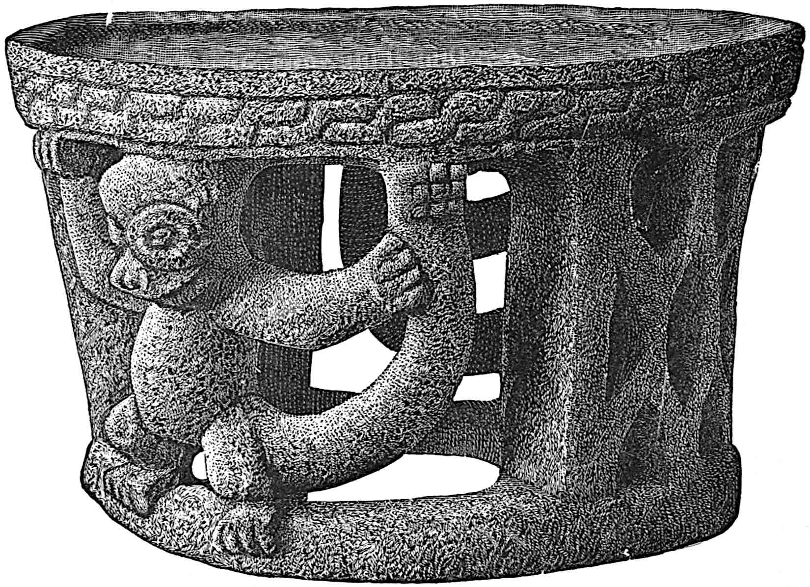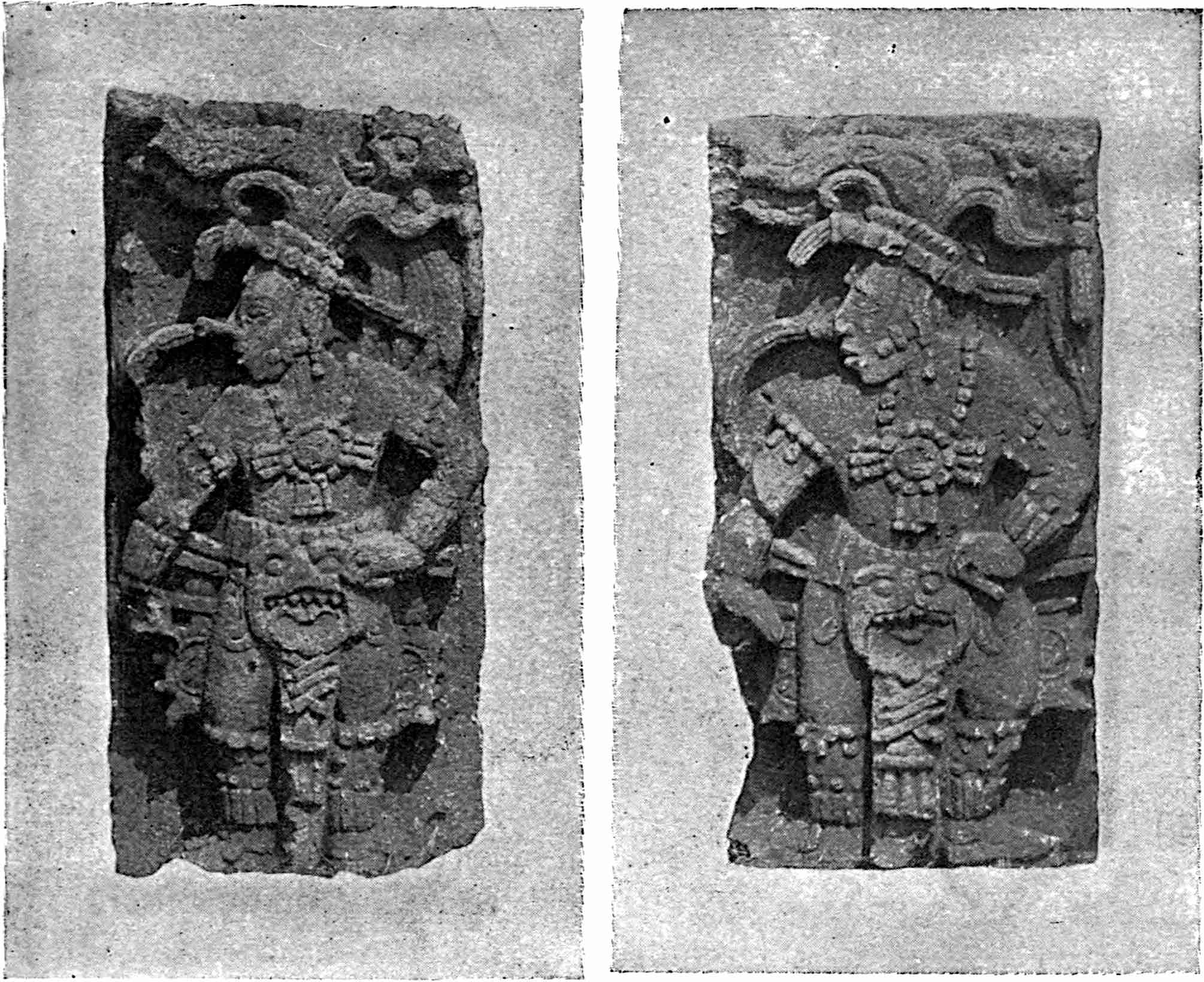 The cause of the glacial period has been much discussed. It seems to have been largely due to changes in land levels,[394] and to other causes not now understood. The people inhabiting the world before it may have been originally much alike in kind and colour with local variations, and the isolation produced by glacial conditions modified this colour and increased the variations, those finally left in hot lands becoming darker, medium temperatures producing brown, still cooler the reds and yellows, and the forests of Europe evolving a shade or shadow people, shrinking from the strong sun; the so-called white race. The glacial epoch is often spoken of as if the whole world were frozen solid, whereas in North America, from the Ohio and the Columbia to the Isthmus, the climate was doubtless about relatively the same as it is now from Davis Strait to the Potomac and from Yakutat Bay to northern California. The ice extended down about to the Ohio River in the East and on lowlands not below the Columbia in the West. The Western mountain tops must have been completely glaciated and all elevated regions were cold, the conditions prevailing resembling those now found in Southern Alaska. The Sierra Nevadas, receiving the warm, moist airs from the Pacific, must have been far more heavily glaciated than the Rockies, which received less moisture in consequence. The ice period is estimated to have endured from ten to twenty thousand years, with an interval of recession in it and subsequent advance. The people were driven southward, and those most favourably situated developed the most. The people most favourably situated were all who were 437already in, or could fight their way to, the temperate lowlands of southern Mexico and Central America, which were rendered somewhat more extensive by the recession of the sea, caused by the withdrawal of the immense quantities of water that were heaped up in ice thousands of feet in thickness.[395] This has been estimated to have lowered the waters of the ocean by from 600 to 1000 feet.[396] The lands thus laid bare were climatically inviting and probably were soon covered with vegetation. In South America the people were crowded northward, or held there by the cold coming from the south. It would be in the northern portions, particularly the lowlands, that we ought to find evidence of the highest development, especially on the side receiving warm currents, and there is where we do find it. We apparently have then a northern and a southern limit to the ancient inhabitants of this hemisphere, within which climatic conditions during the period of great cold, and for some time thereafter, were most favourable to human development. This limit in the Northern continent is latitude 23 and in the Southern also 23. Within these lines the great precolumbian development took place, 439and the heart of this development on the Northern continent seems to have rested between the Isthmus of Tehuantepec and the present upper frontier of Honduras, chiefly on the lowlands, and probably also on lands now beneath the ocean.