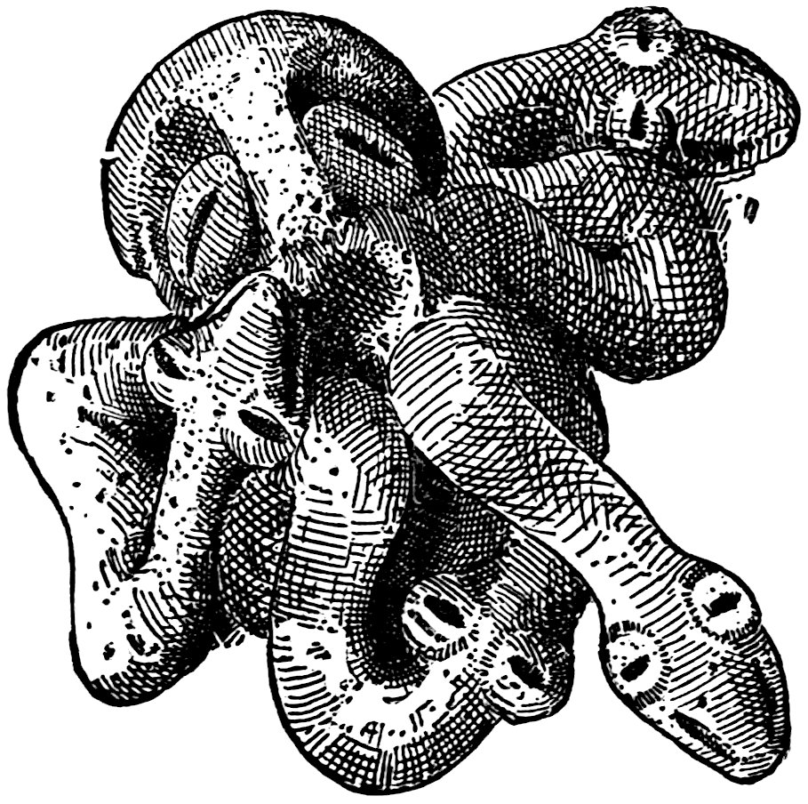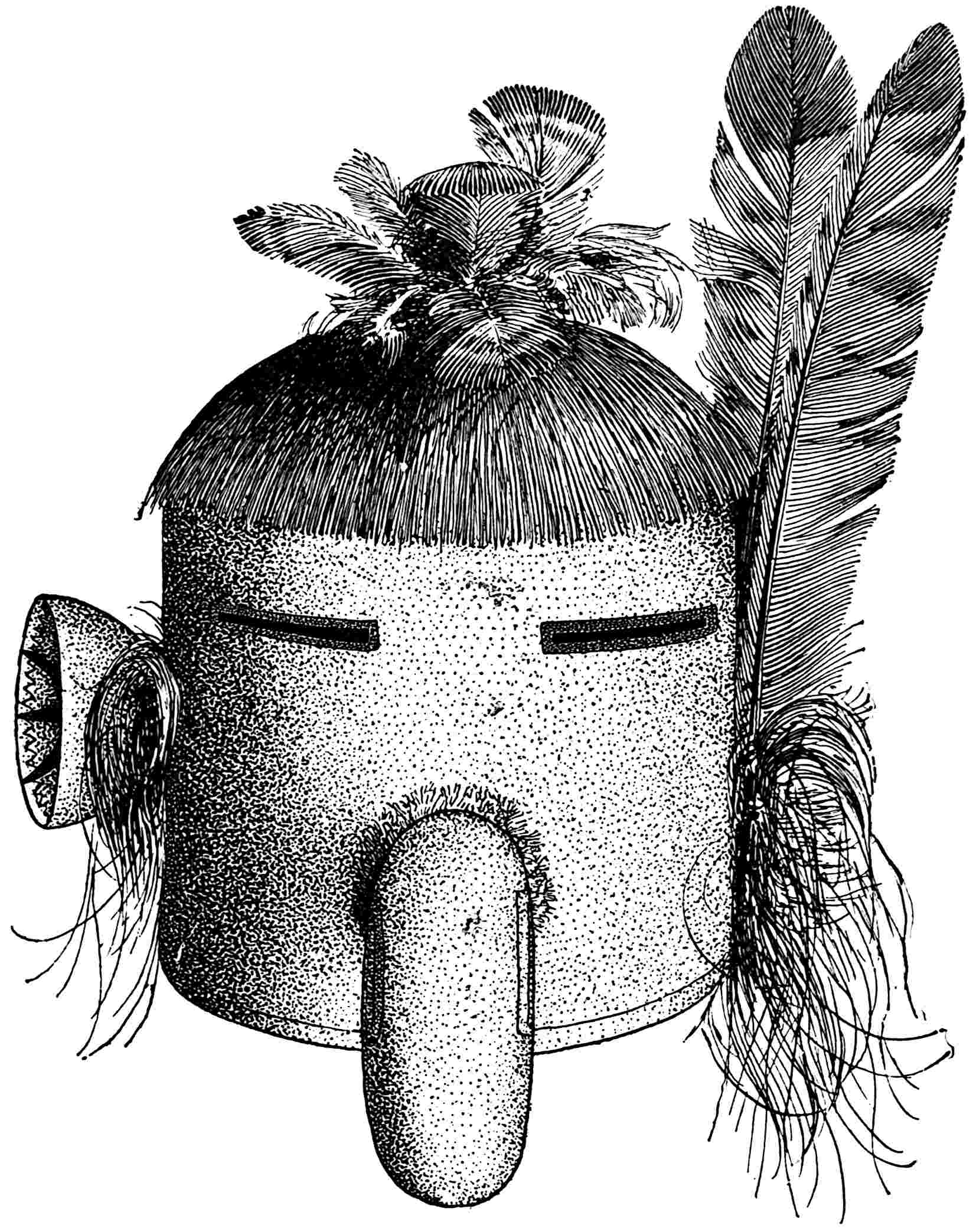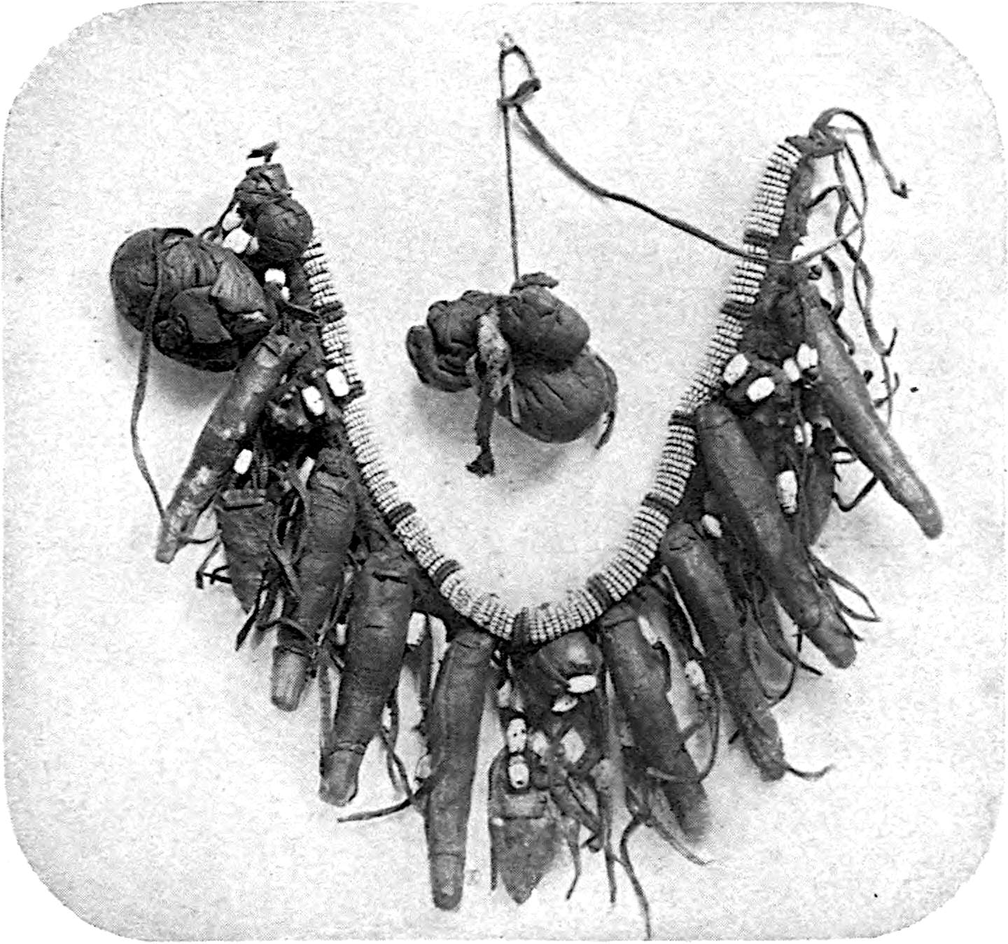 The sign of clan or gens membership was the totem, all members of the same gens having the same totem, and his or her name usually indicating this totem. For example, if we know an Amerind woman’s name to be Spotted Fawn, we place her at once in the deer clan. The deer is the animal that she looks up to as being most intimately connected with her past and her future, and from which her ancestors were descended. This is the clan or gens totem. As mentioned in a previous chapter, there are also two other kinds of totems, those pertaining to sex and those pertaining to the individual alone. Totems are always chosen from a class of organic objects, while a fetich may be anything at all. Thus the totems are deer, frogs, bears, snakes, corn, etc., while a fetich may be a pebble, a piece of glass wrapped in a bit 421of buckskin together with a feather, or some similar object. The fetich was a talisman, the totem a beneficent attending spirit and a sign of family and origin.