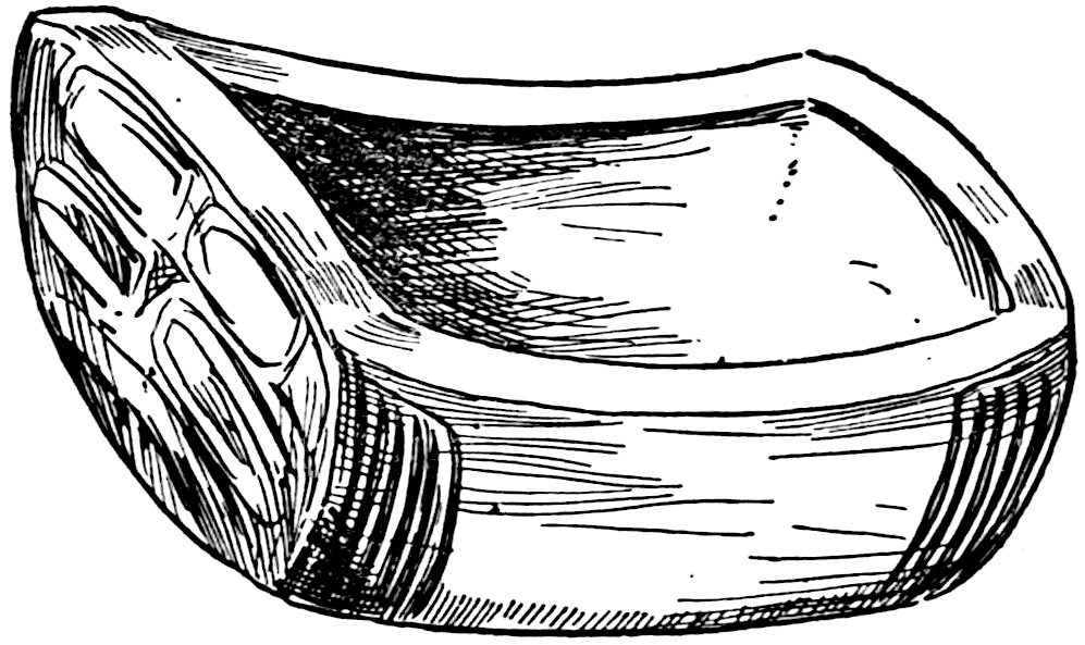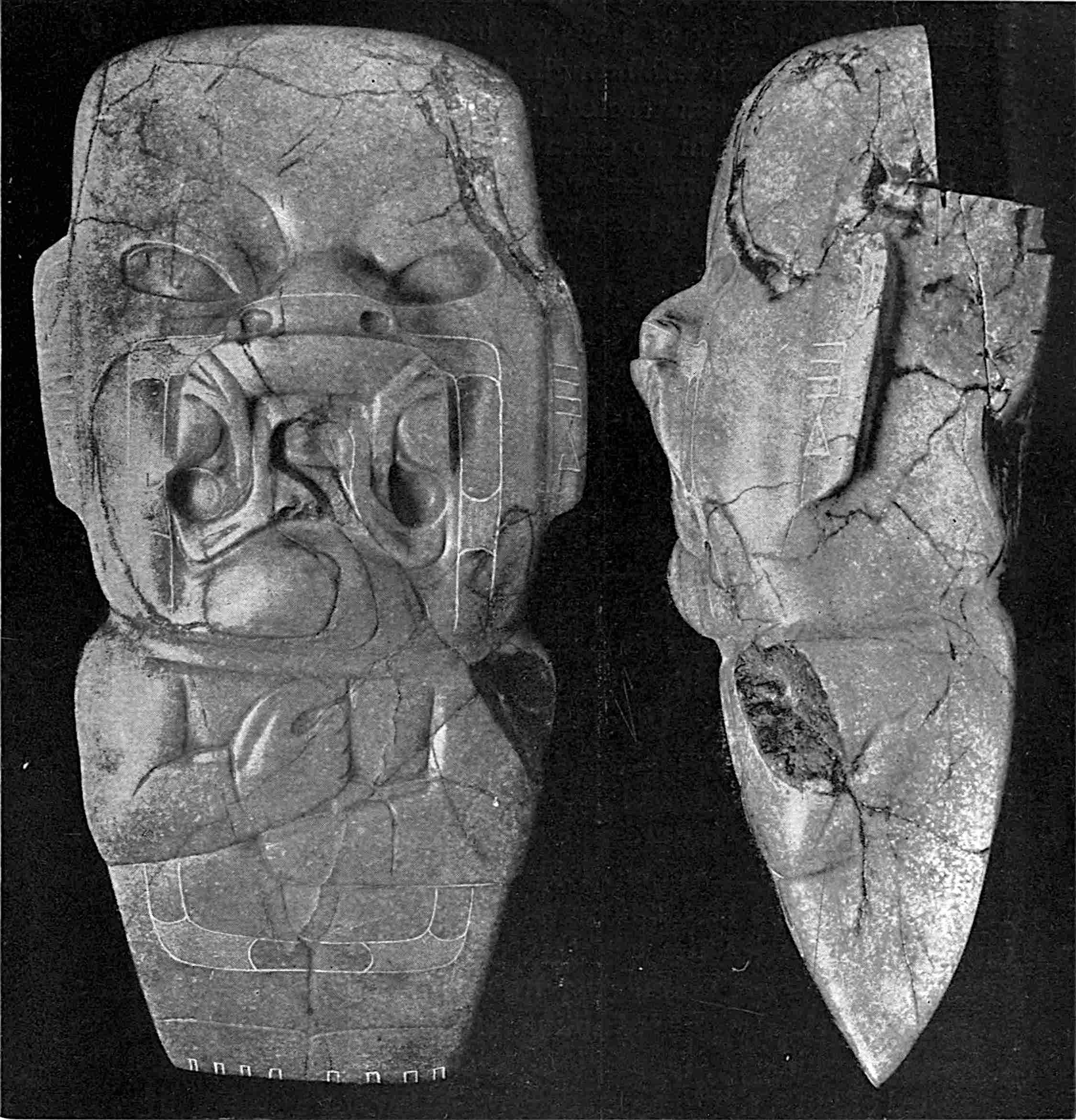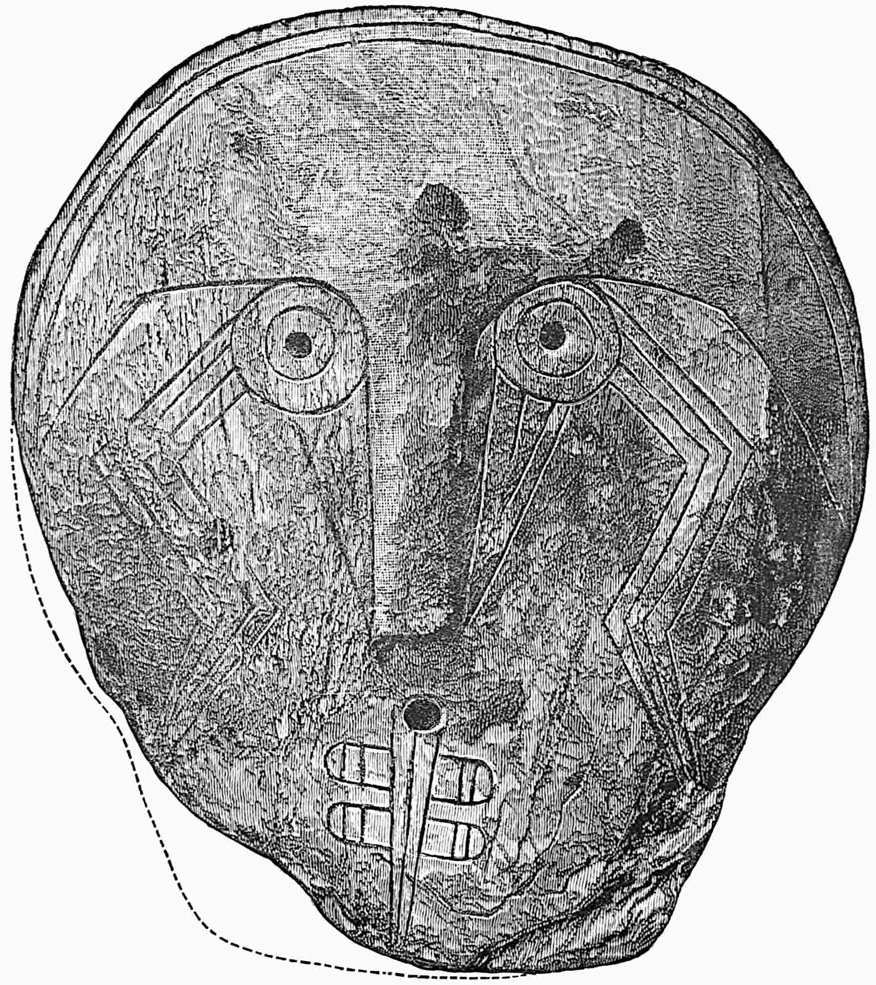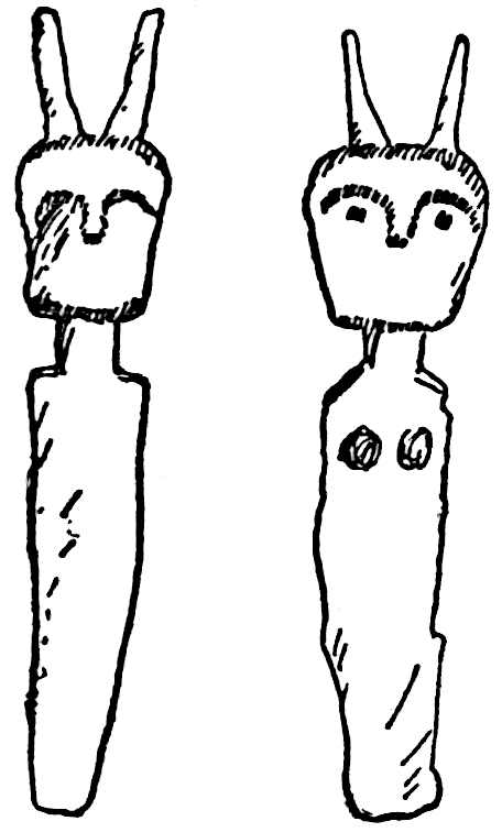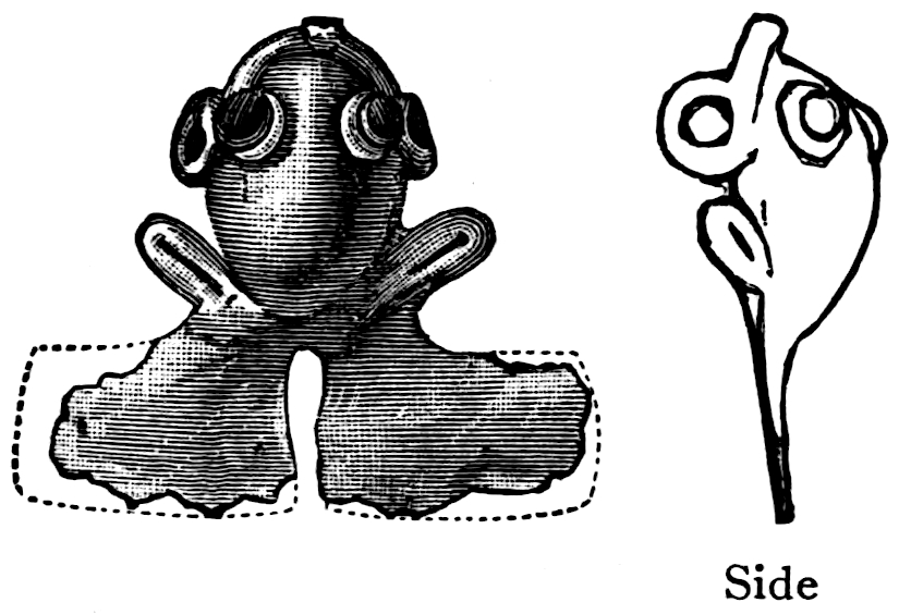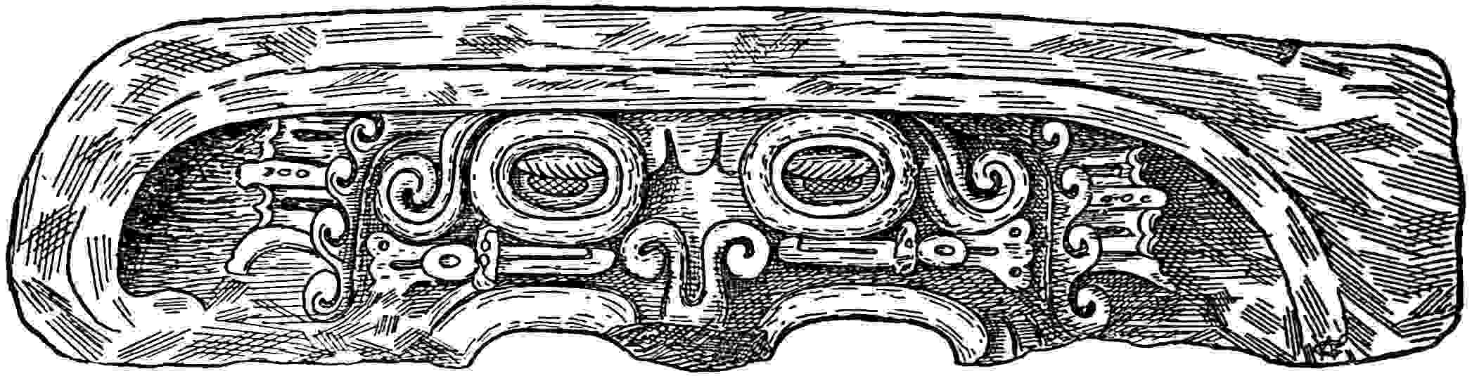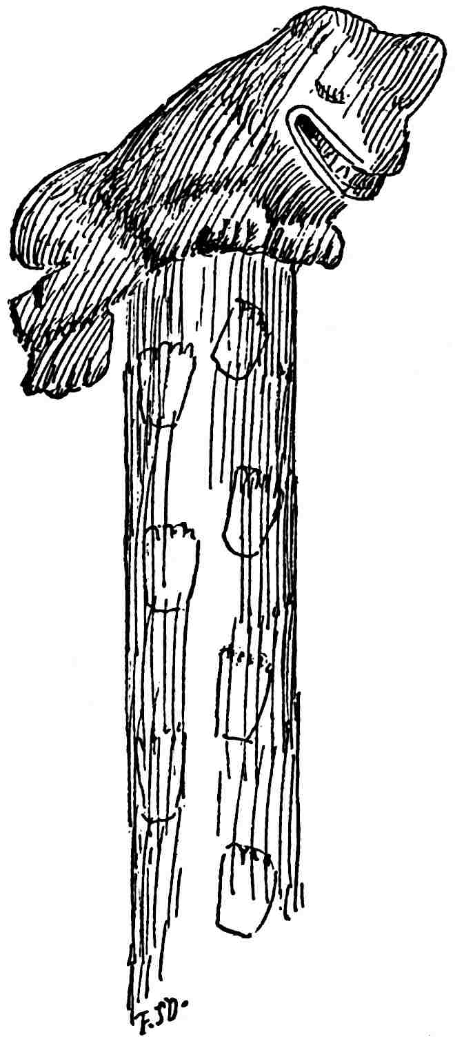 The material is antler. Found in a stone cist somewhat resembling the stone graves of Kentucky and Ohio, but covered by a heap of jagged basaltic rocks about 8 feet in diameter. The skeleton of a child was found in the cist. The antler figure is 247 mm. long and from 2 to 5 mm. thick. The front is engraved as shown above. The back is plain. See paper on this subject by Harlan I. Smith.—Bulletin American Museum, vol. xx, pp. 195–203.