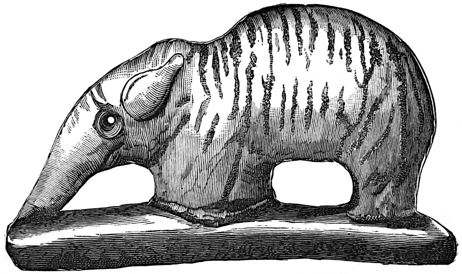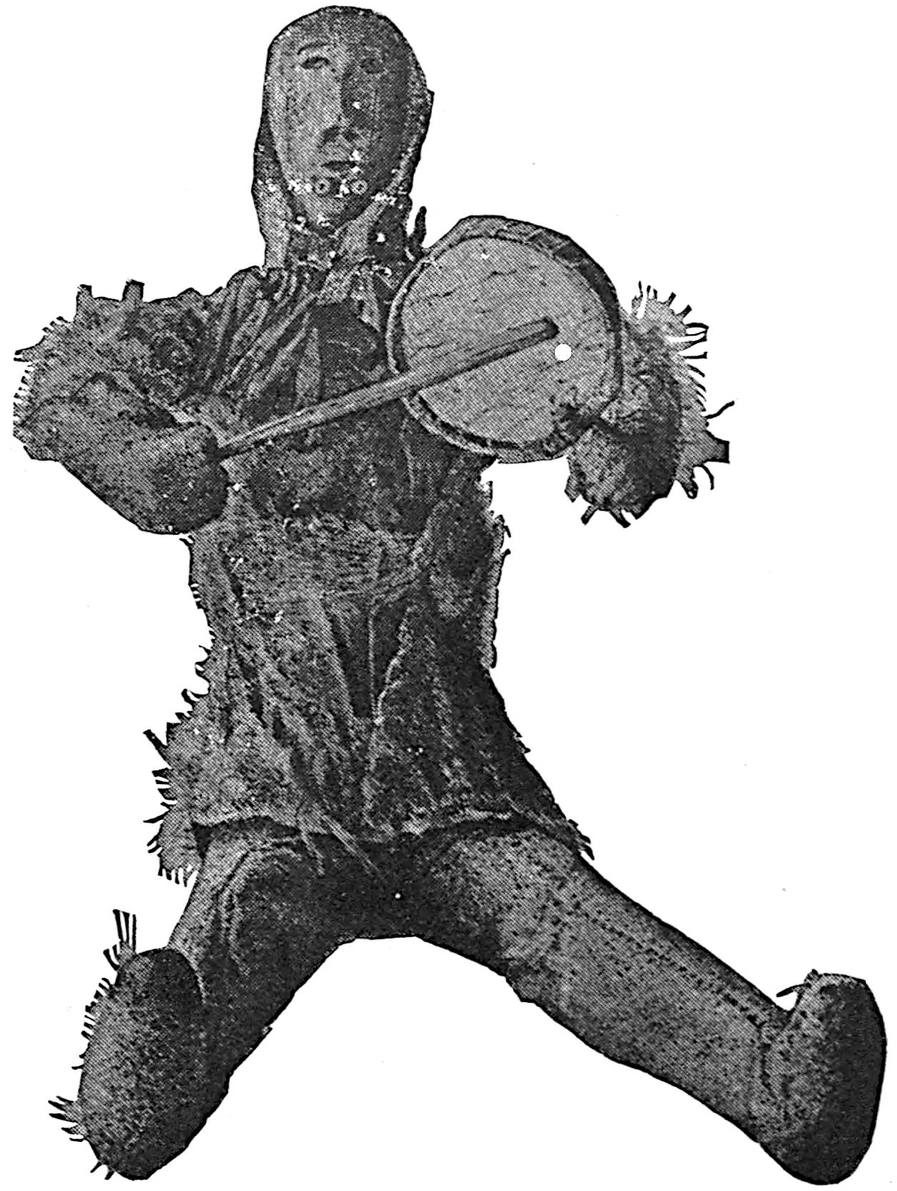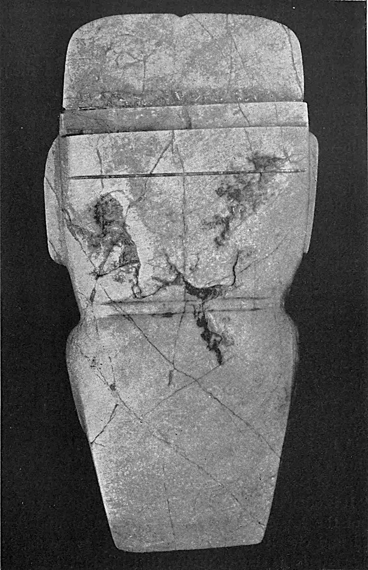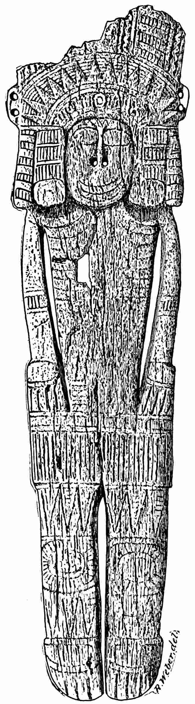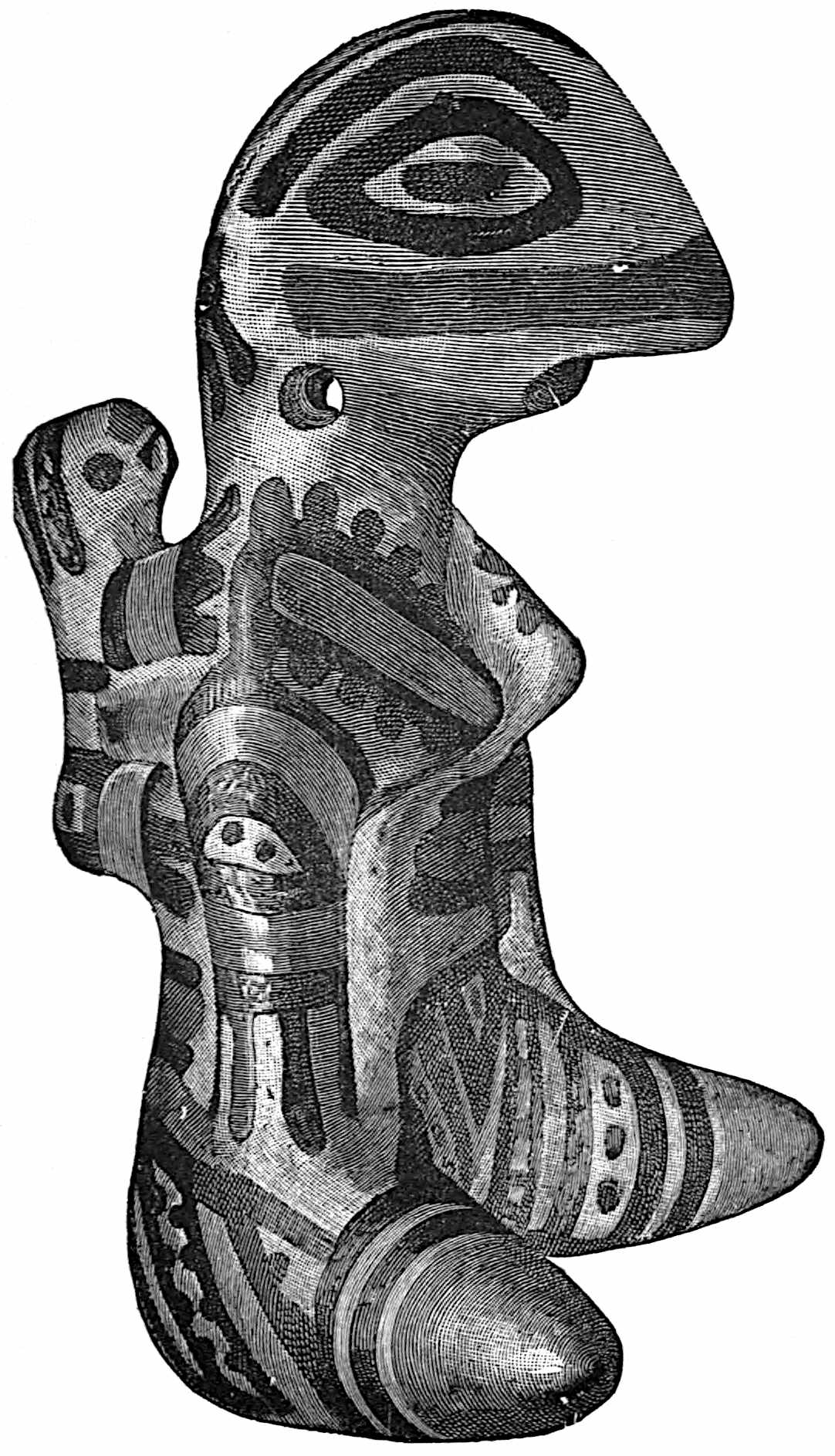 The material is antler. Found in a stone cist somewhat resembling the stone graves of Kentucky and Ohio, but covered by a heap of jagged basaltic rocks about 8 feet in diameter. The skeleton of a child was found in the cist. The antler figure is 247 mm. long and from 2 to 5 mm. thick. The front is engraved as shown above. The back is plain. See paper on this subject by Harlan I. Smith.—Bulletin American Museum, vol. xx, pp. 195–203.