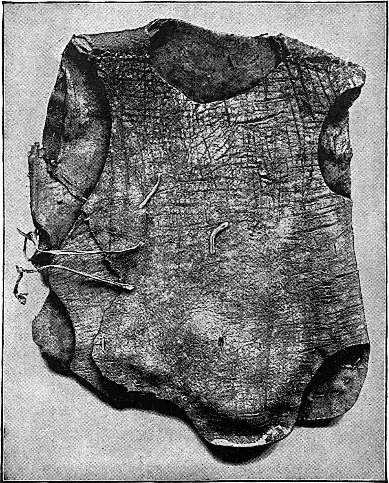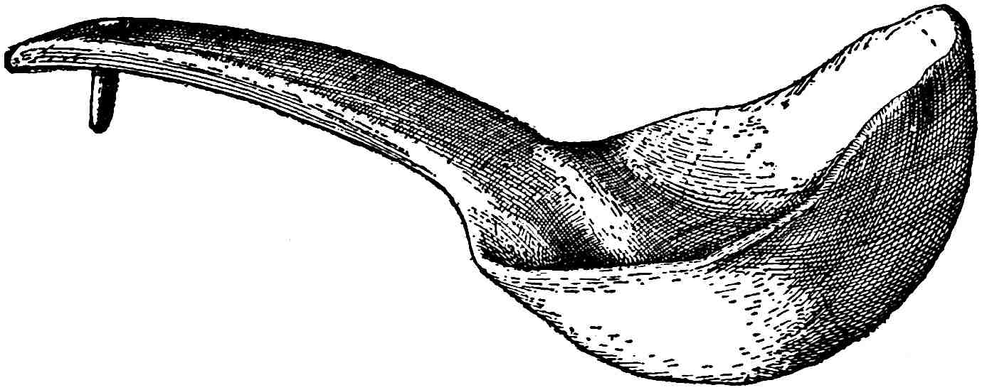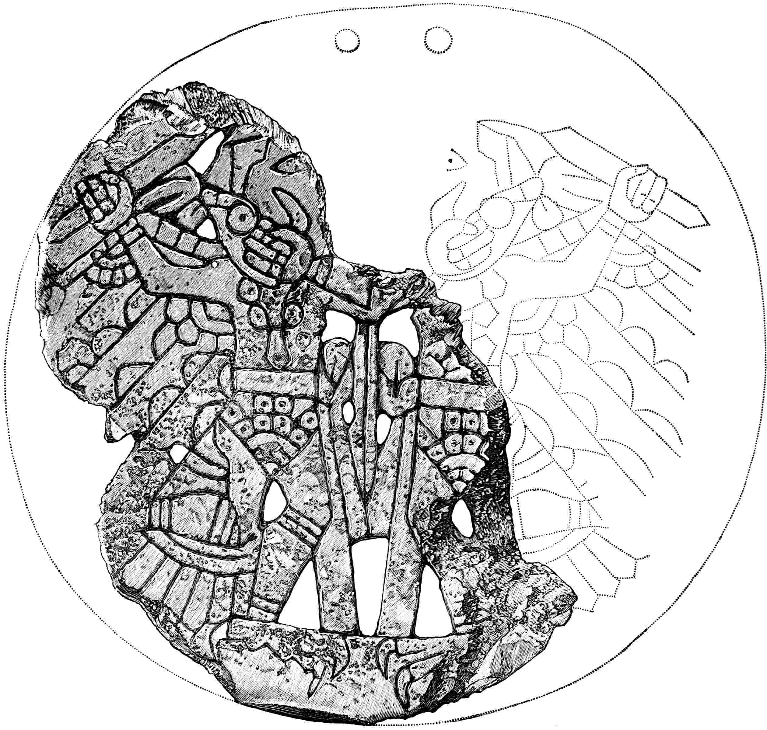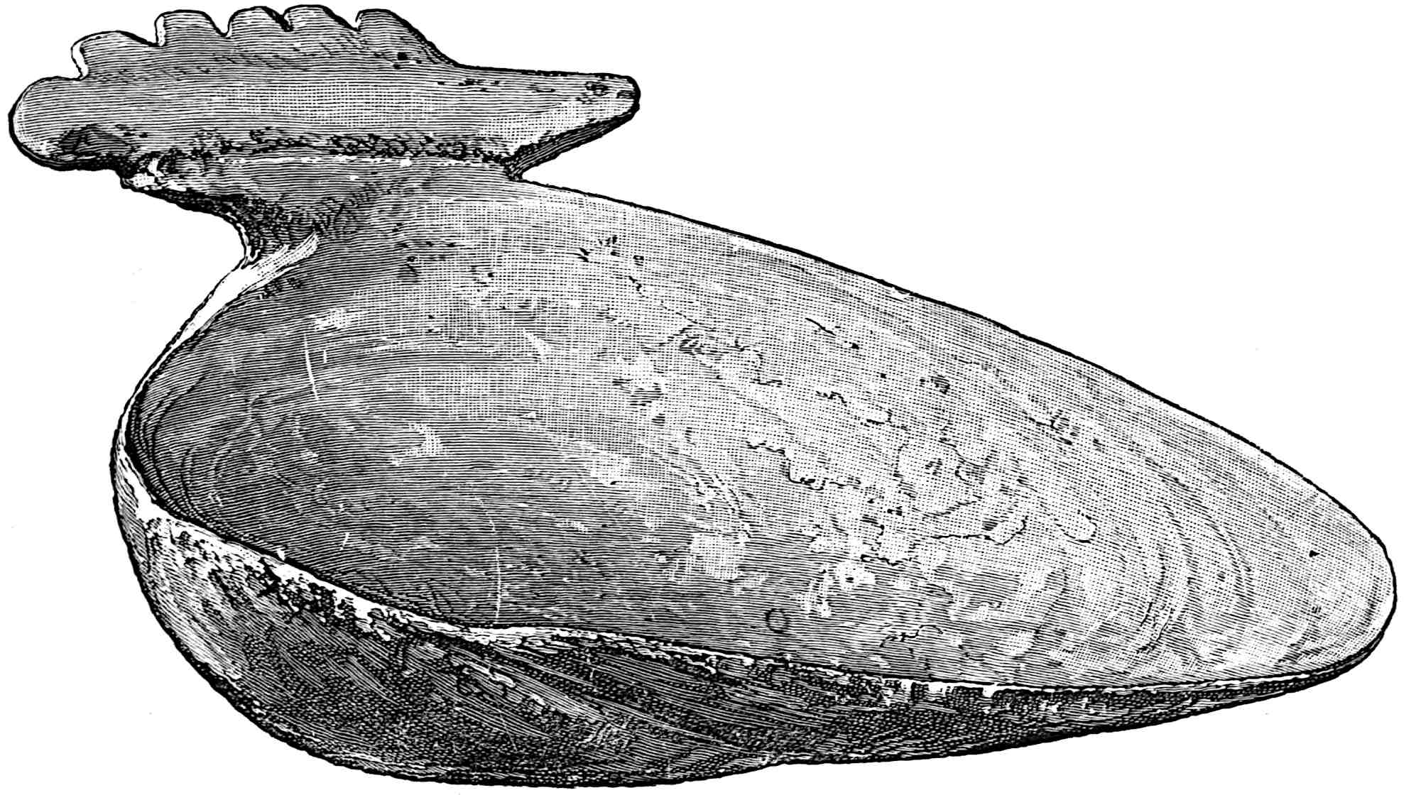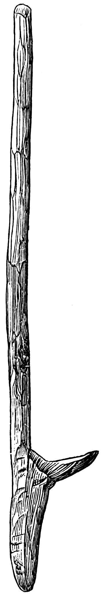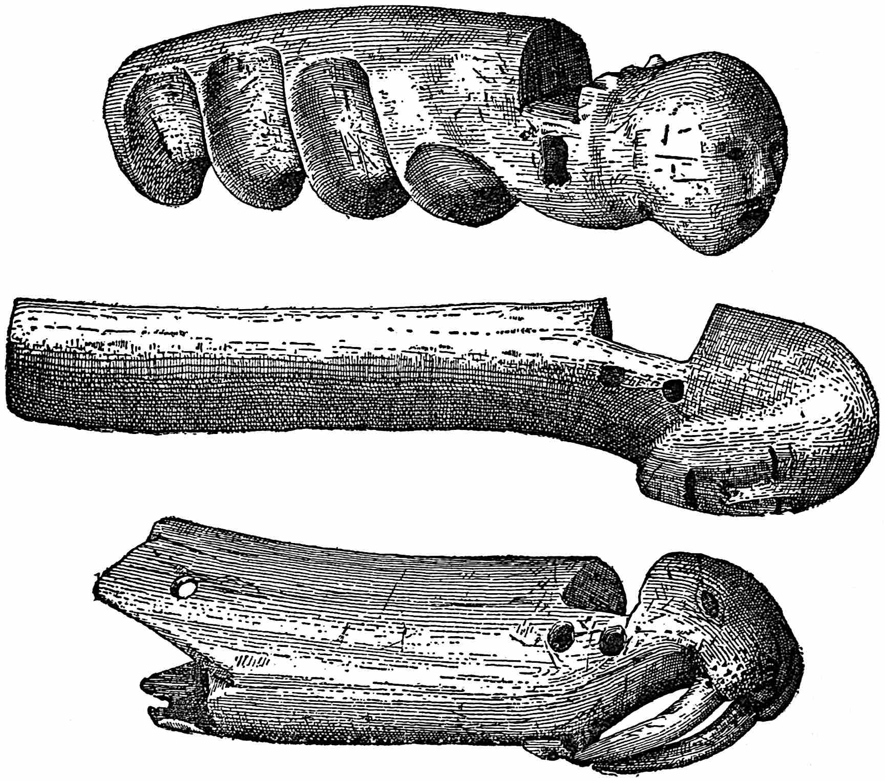 The material is antler. Found in a stone cist somewhat resembling the stone graves of Kentucky and Ohio, but covered by a heap of jagged basaltic rocks about 8 feet in diameter. The skeleton of a child was found in the cist. The antler figure is 247 mm. long and from 2 to 5 mm. thick. The front is engraved as shown above. The back is plain. See paper on this subject by Harlan I. Smith.—Bulletin American Museum, vol. xx, pp. 195–203.