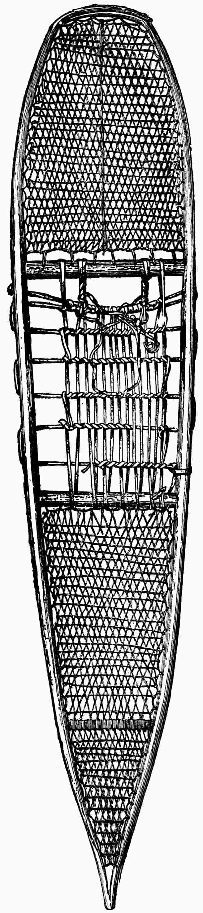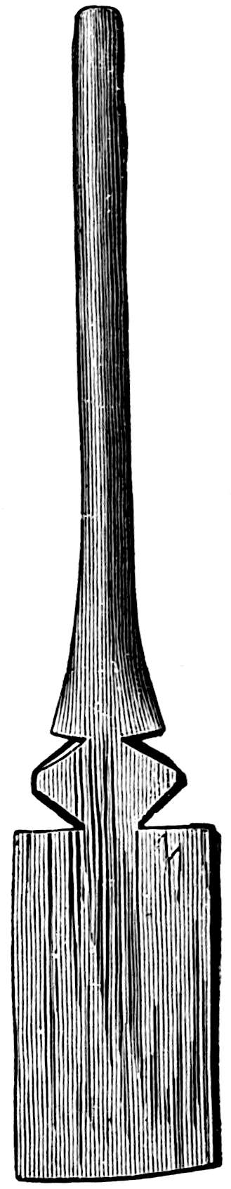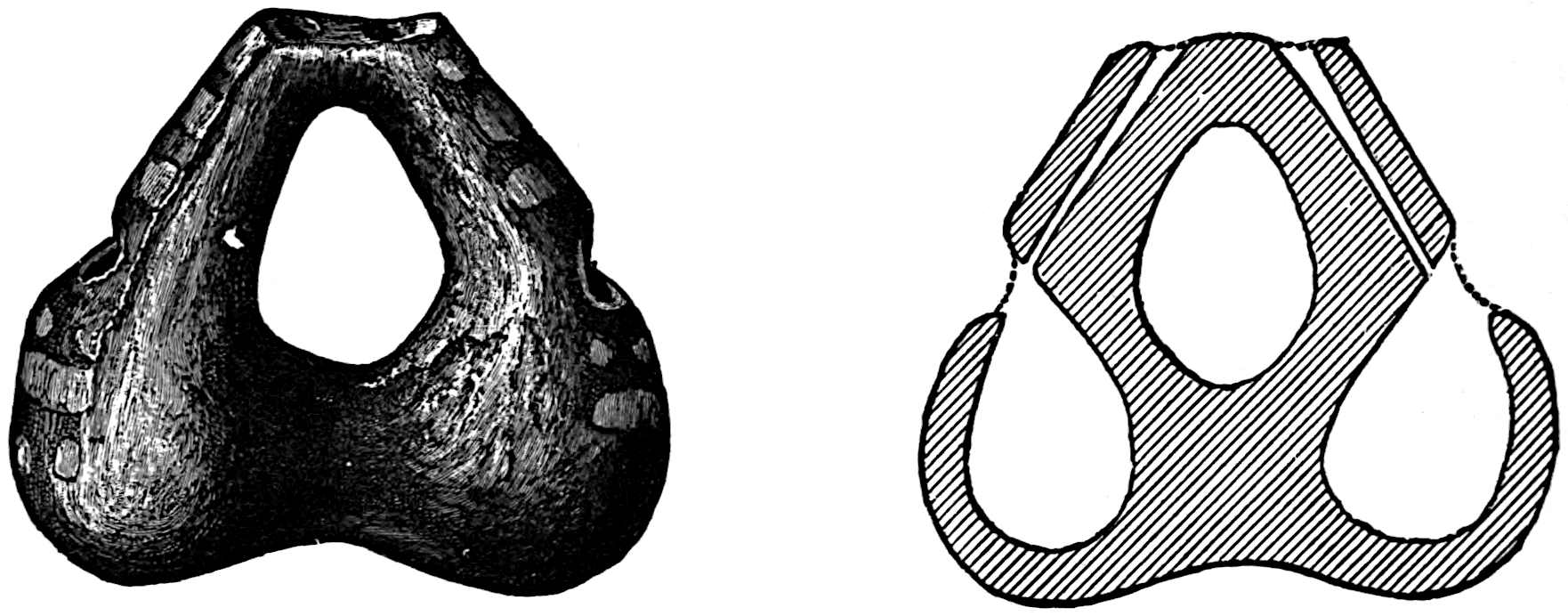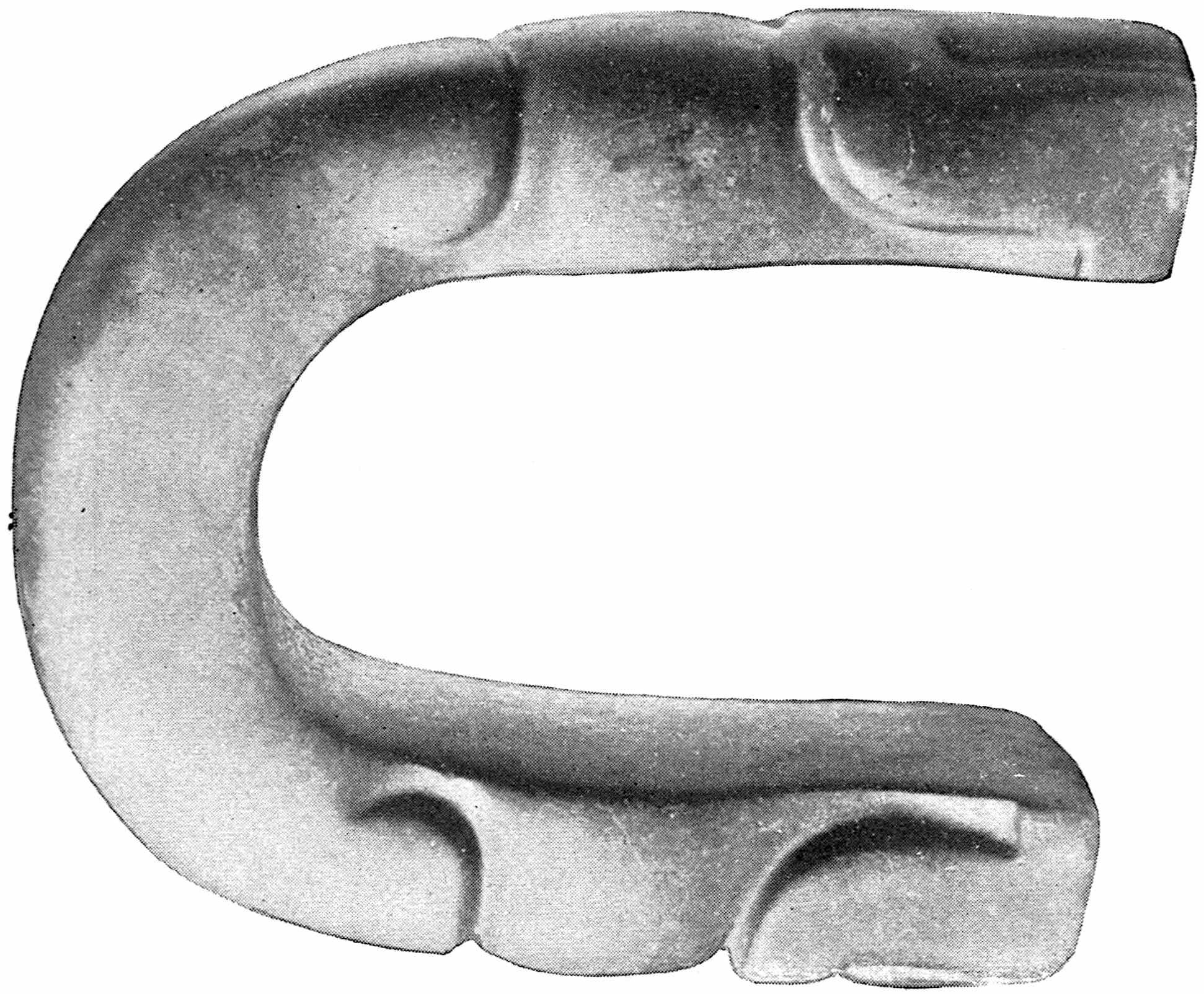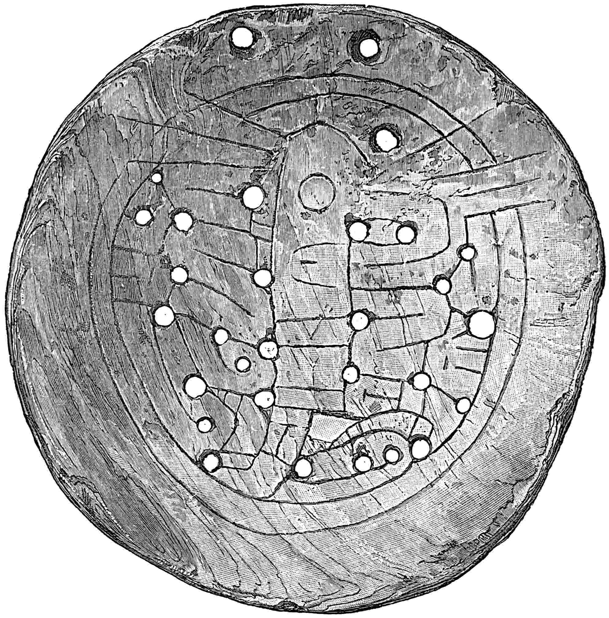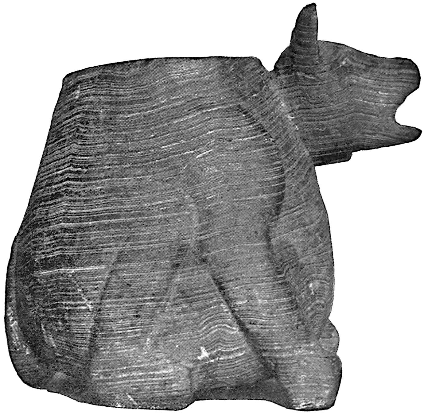 The material is antler. Found in a stone cist somewhat resembling the stone graves of Kentucky and Ohio, but covered by a heap of jagged basaltic rocks about 8 feet in diameter. The skeleton of a child was found in the cist. The antler figure is 247 mm. long and from 2 to 5 mm. thick. The front is engraved as shown above. The back is plain. See paper on this subject by Harlan I. Smith.—Bulletin American Museum, vol. xx, pp. 195–203.