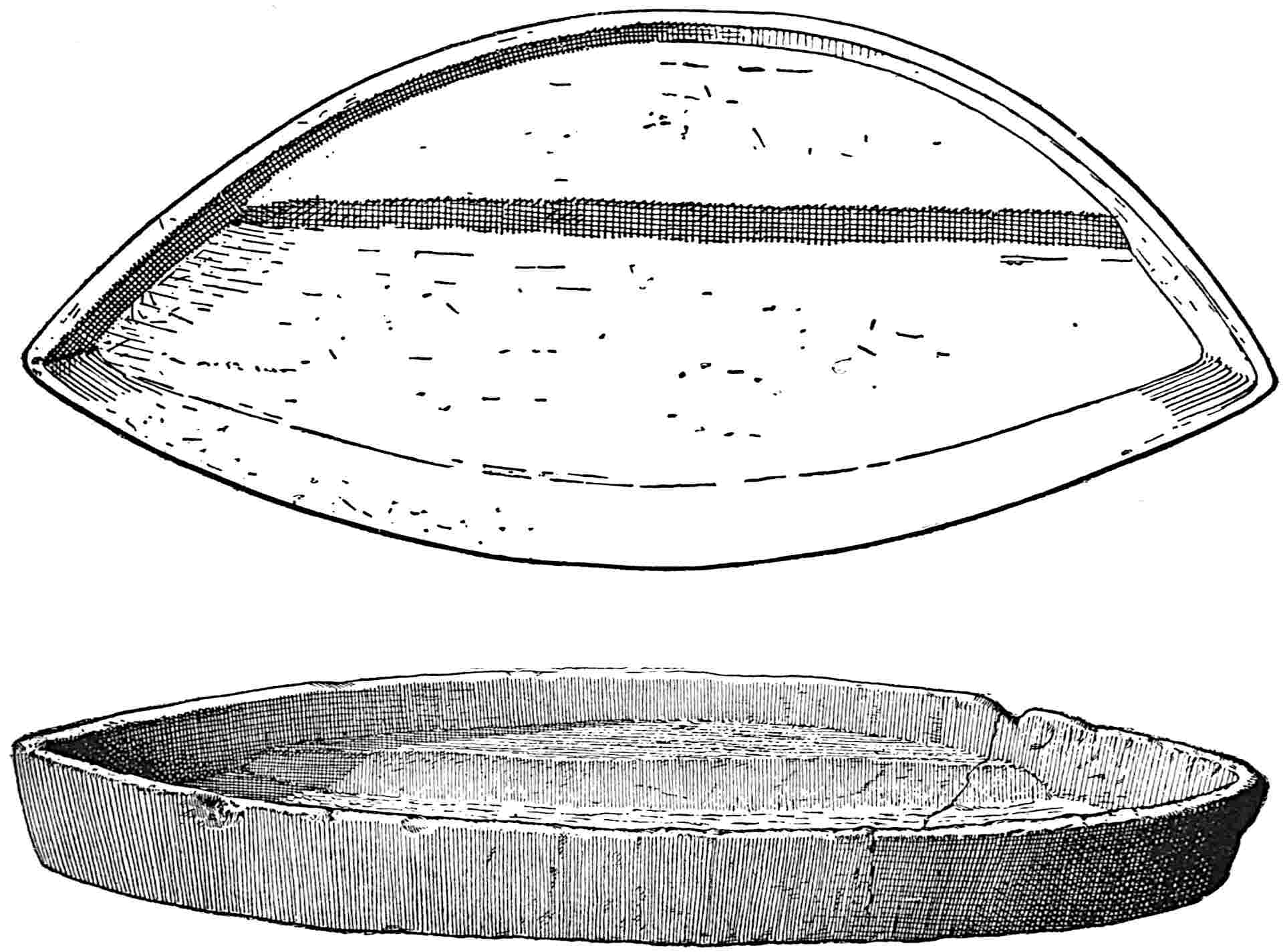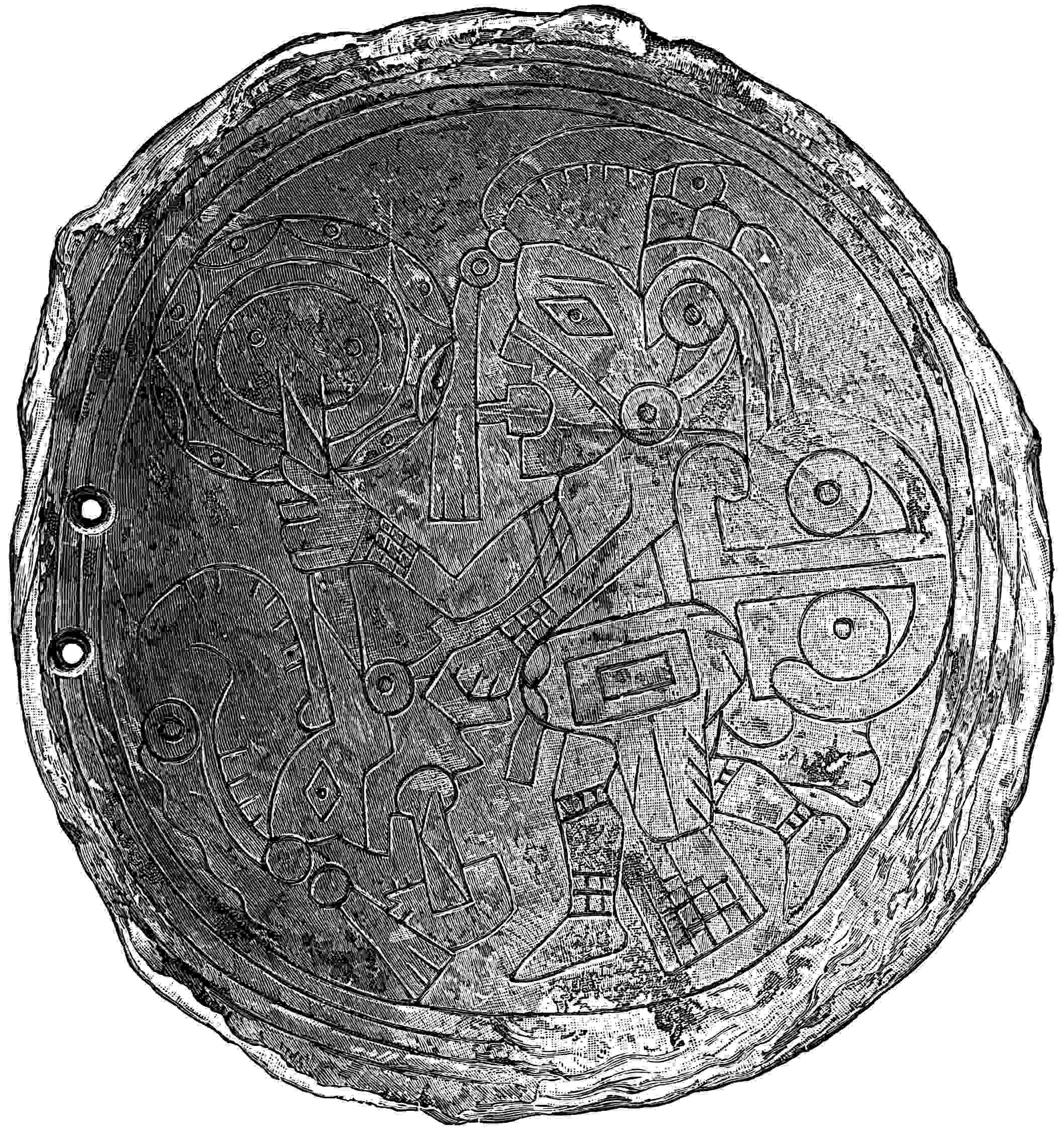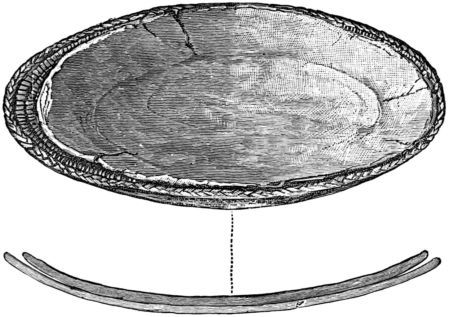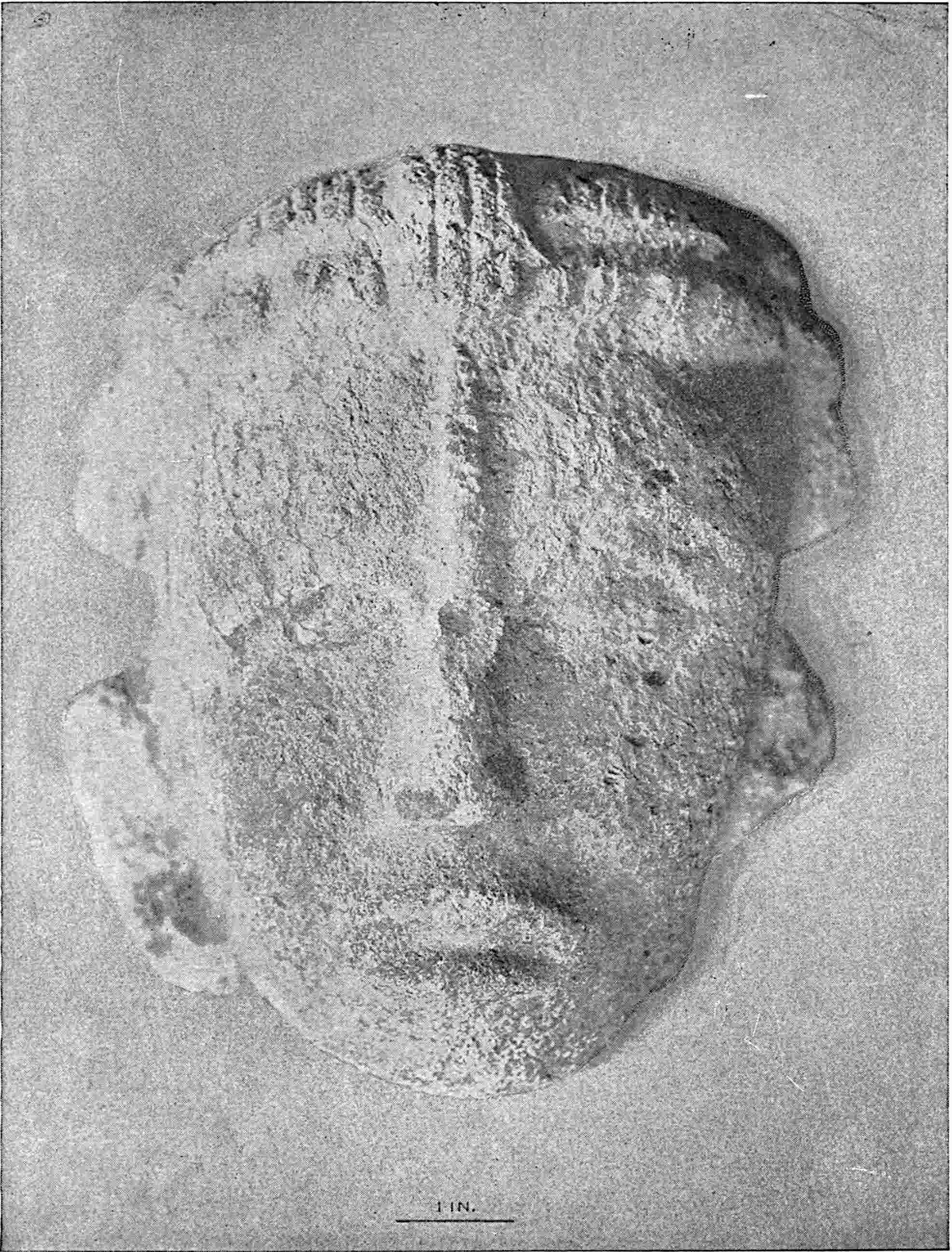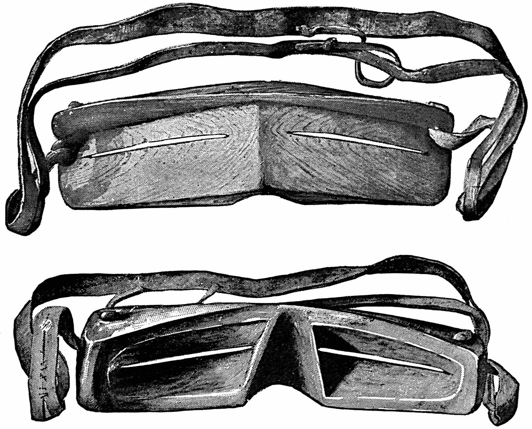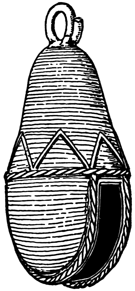 The material is antler. Found in a stone cist somewhat resembling the stone graves of Kentucky and Ohio, but covered by a heap of jagged basaltic rocks about 8 feet in diameter. The skeleton of a child was found in the cist. The antler figure is 247 mm. long and from 2 to 5 mm. thick. The front is engraved as shown above. The back is plain. See paper on this subject by Harlan I. Smith.—Bulletin American Museum, vol. xx, pp. 195–203.