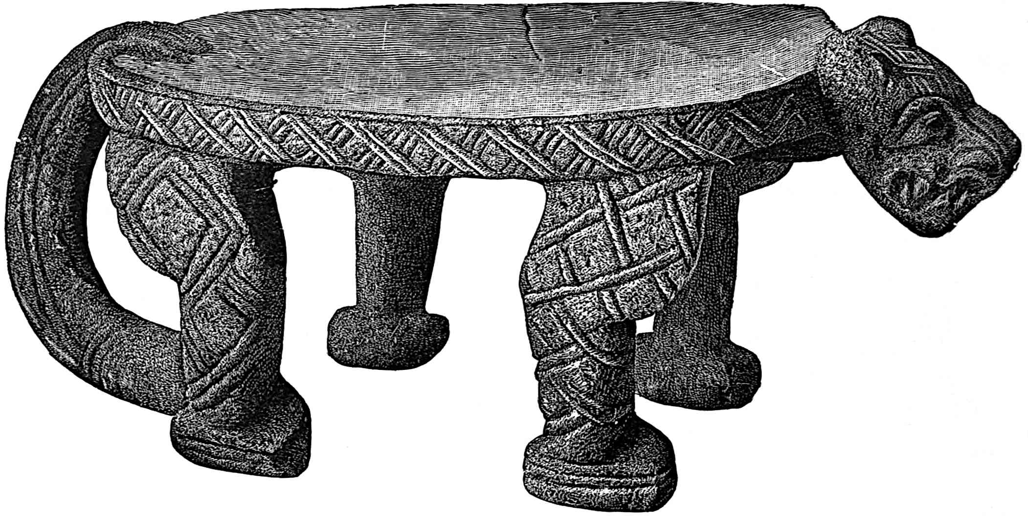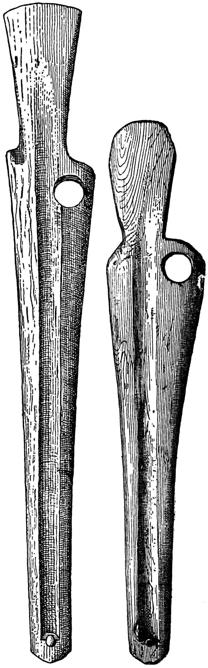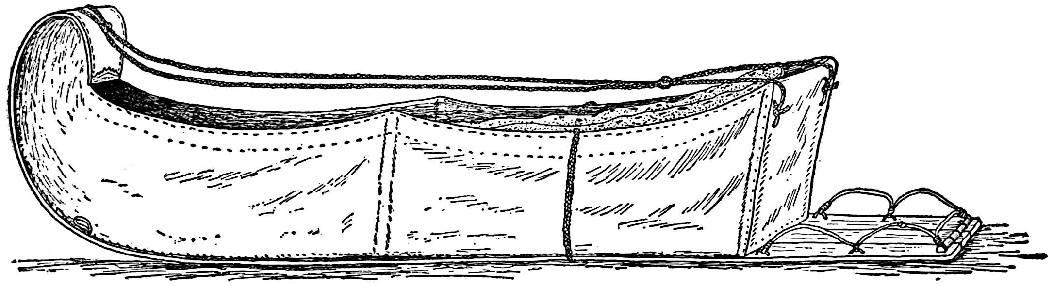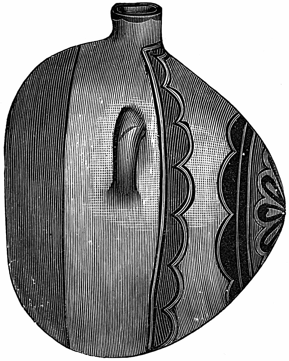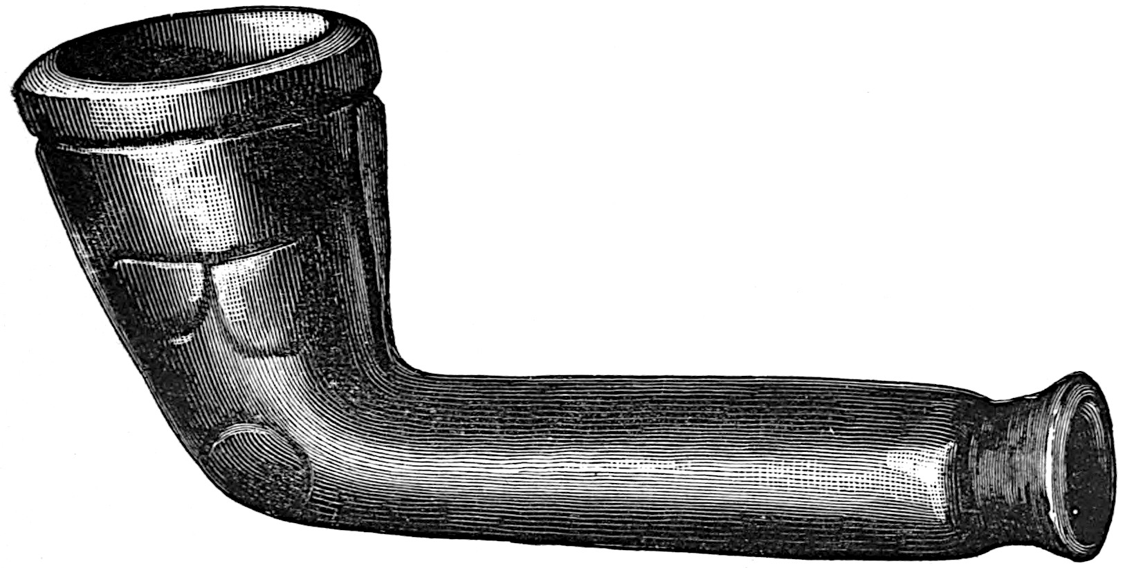 The material is antler. Found in a stone cist somewhat resembling the stone graves of Kentucky and Ohio, but covered by a heap of jagged basaltic rocks about 8 feet in diameter. The skeleton of a child was found in the cist. The antler figure is 247 mm. long and from 2 to 5 mm. thick. The front is engraved as shown above. The back is plain. See paper on this subject by Harlan I. Smith.—Bulletin American Museum, vol. xx, pp. 195–203.