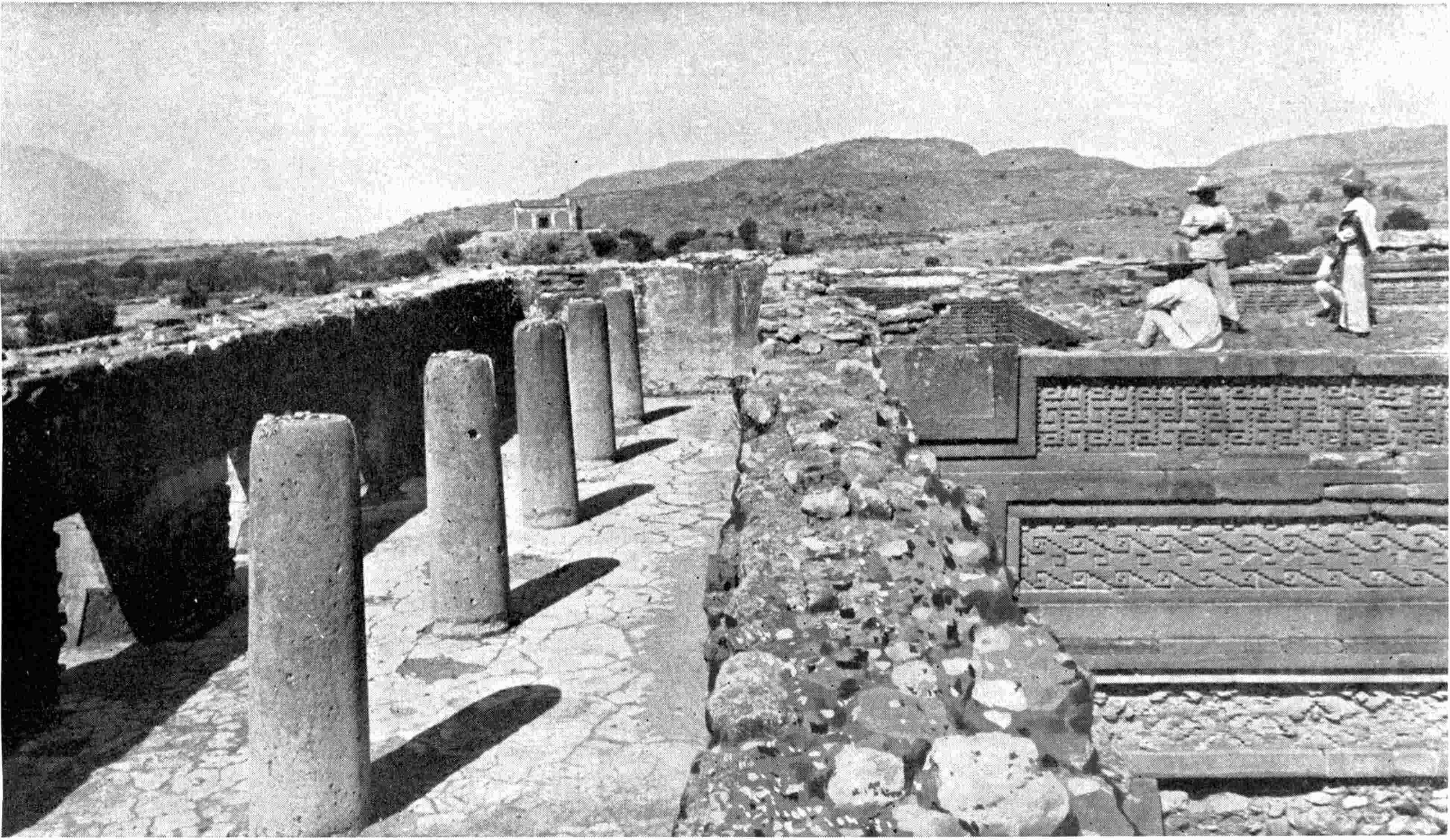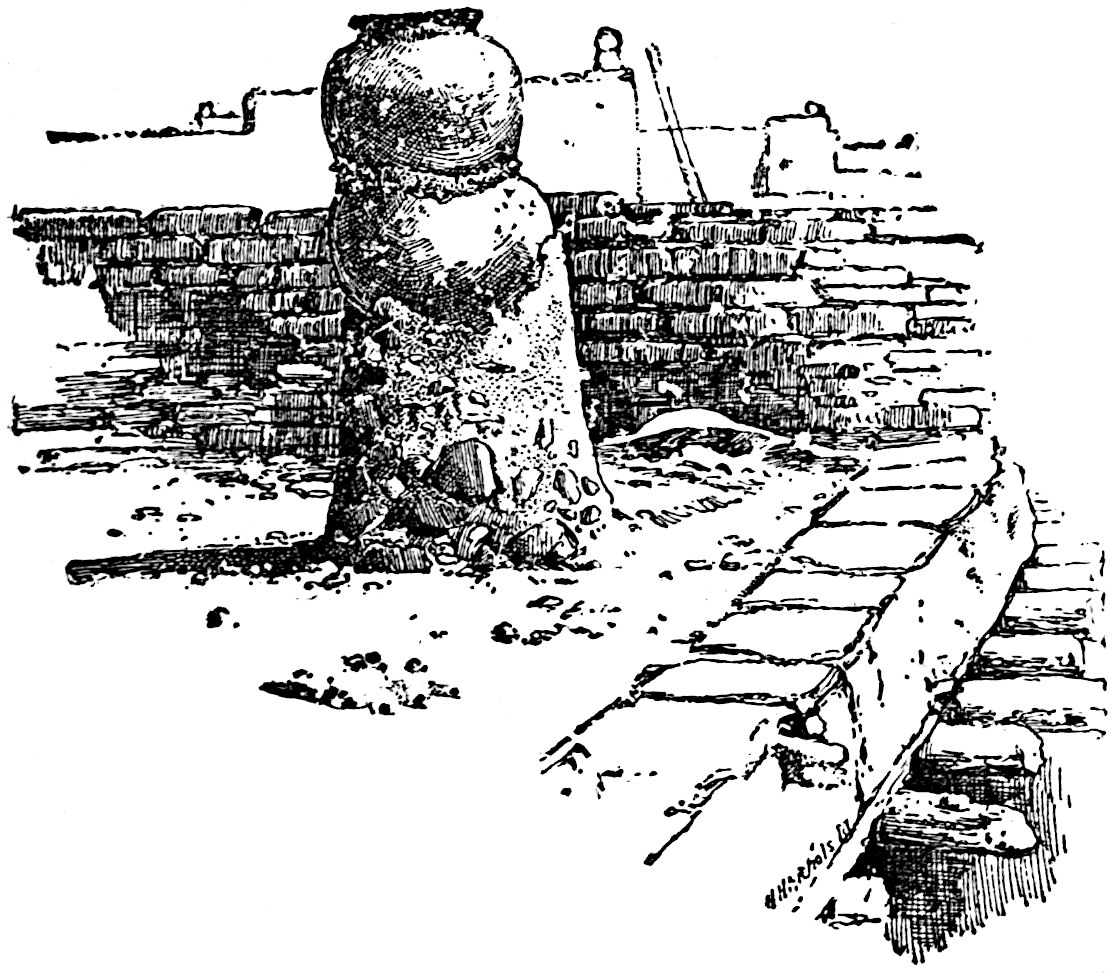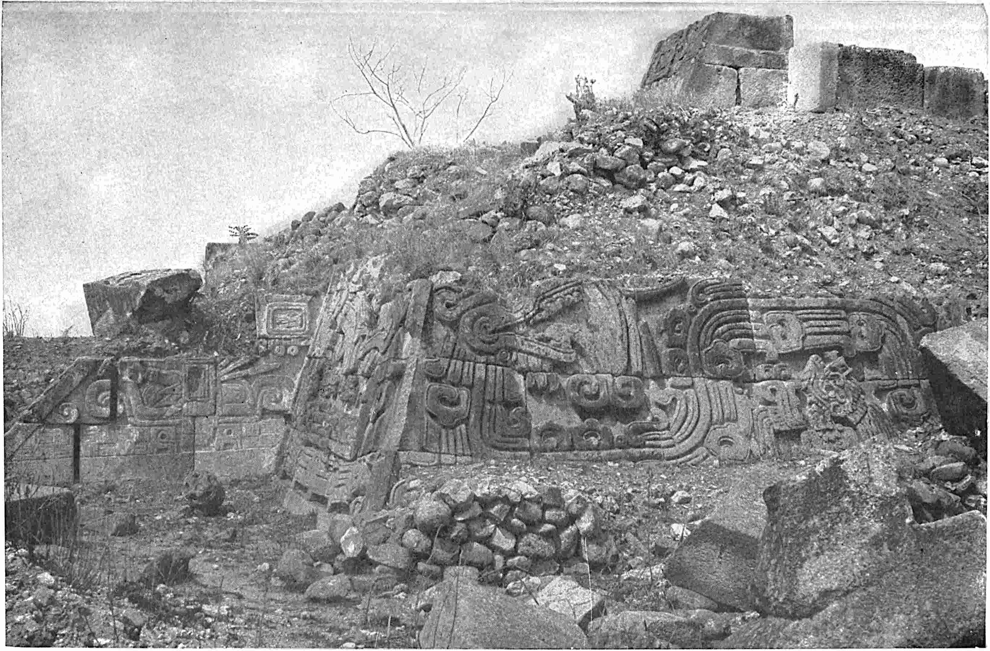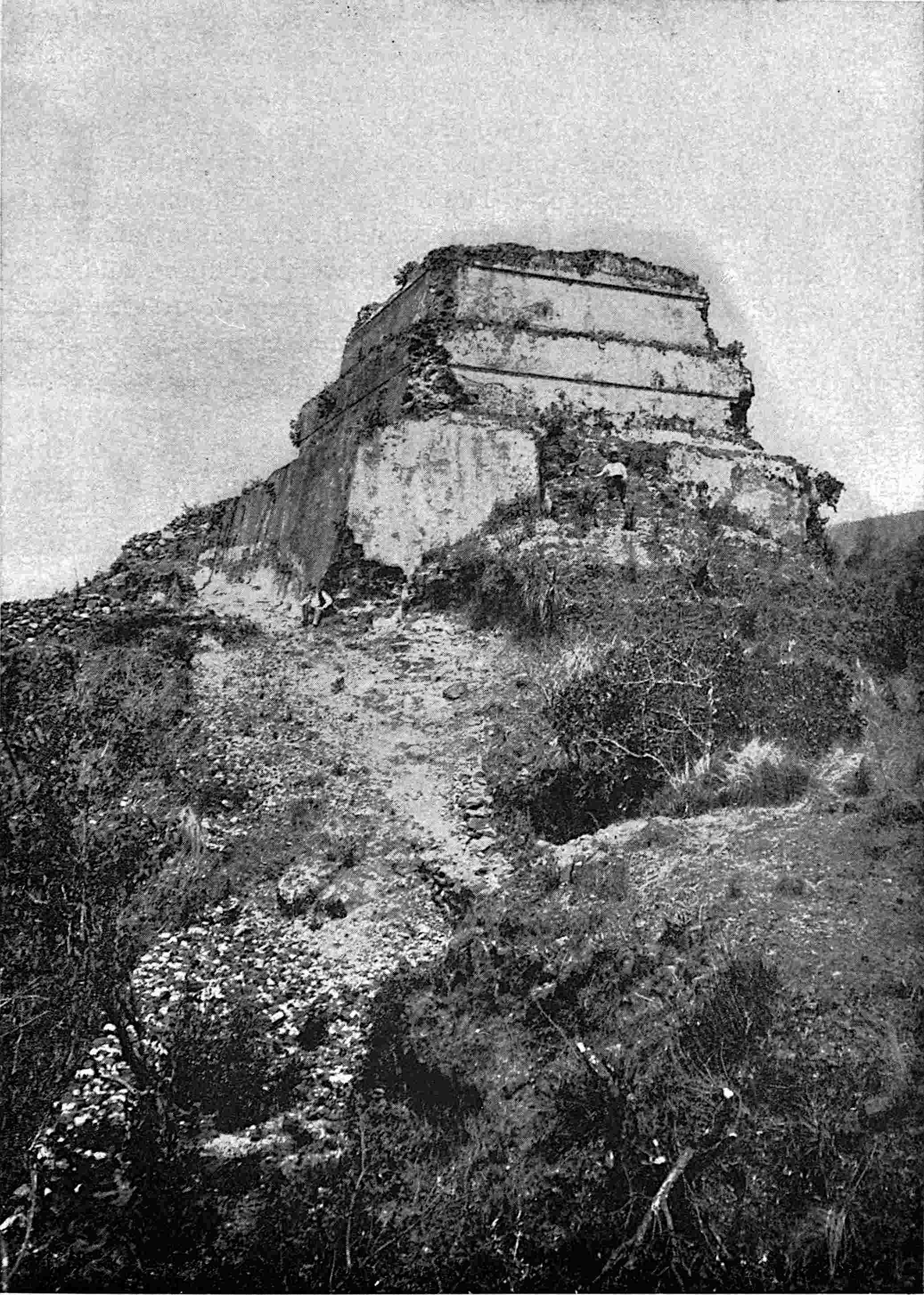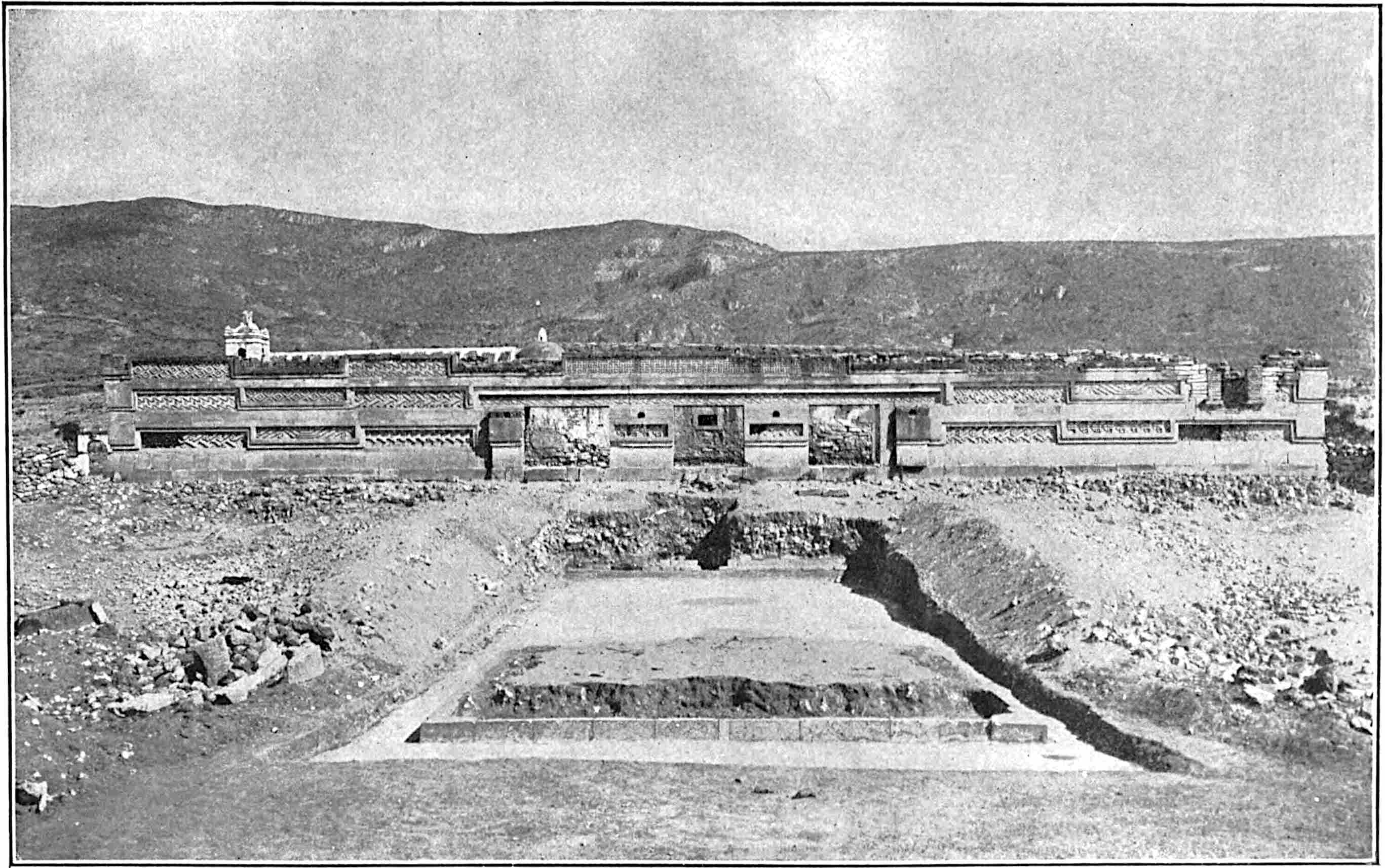 The excavation is shown that was made by Saville in January, 1900. A cement floor was uncovered and the base of a square that was probably a shrine. On the left, behind, is seen the top of the Catholic church that has been built on the site of one of the ancient structures. Excavations at the sites of old cities will doubtless yield valuable returns. Recently (October, 1900) a sewer excavation in the City of Mexico, near the Cathedral, the site of the great teocalli, furnished several wagon-loads of idols, gold objects, jade beads, etc. See also pages 209, 246