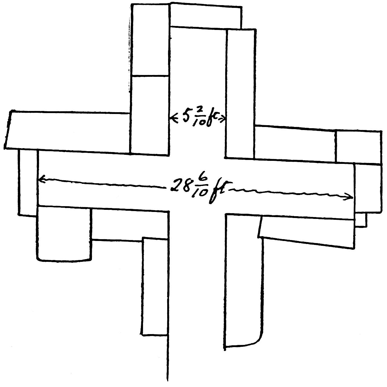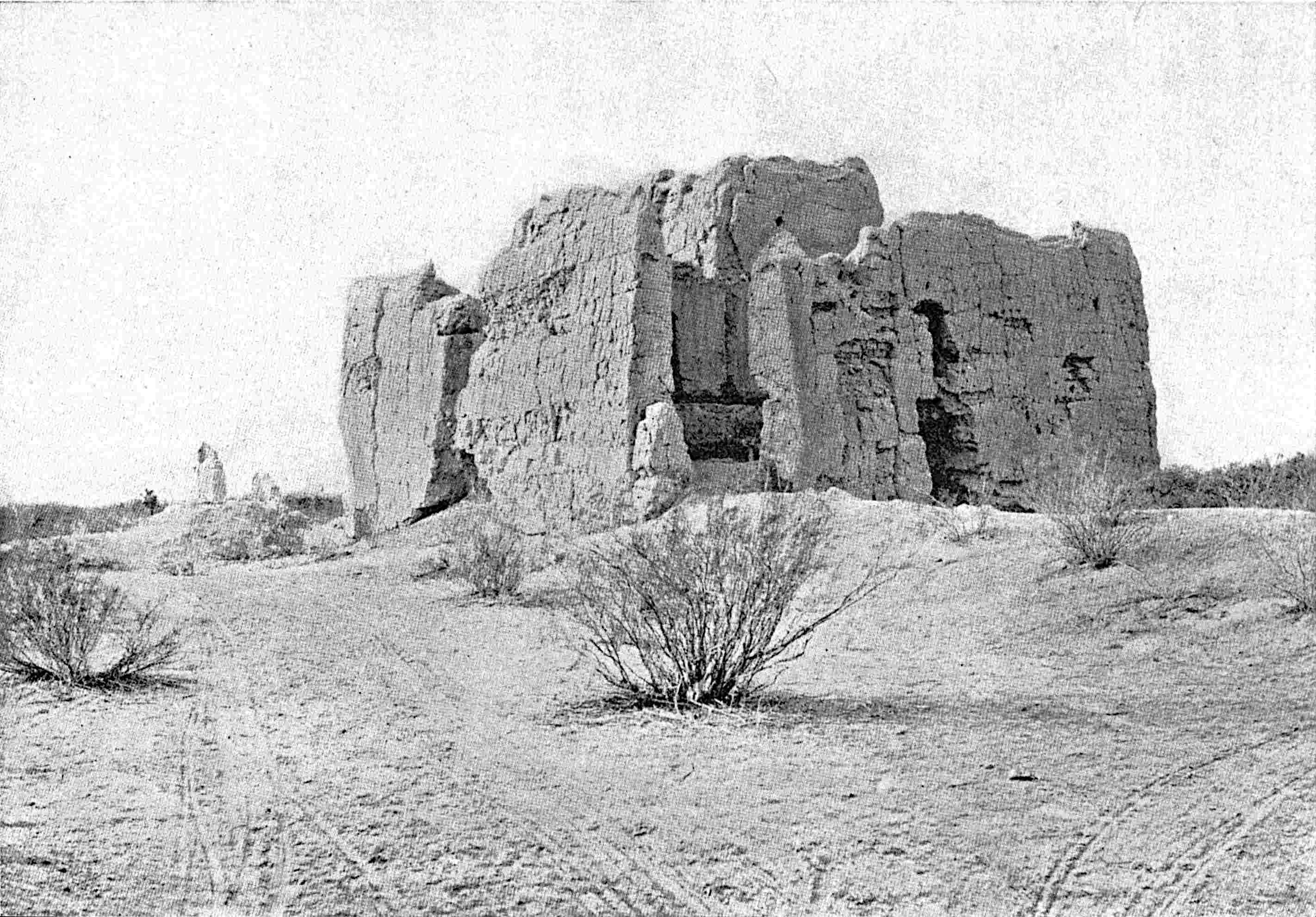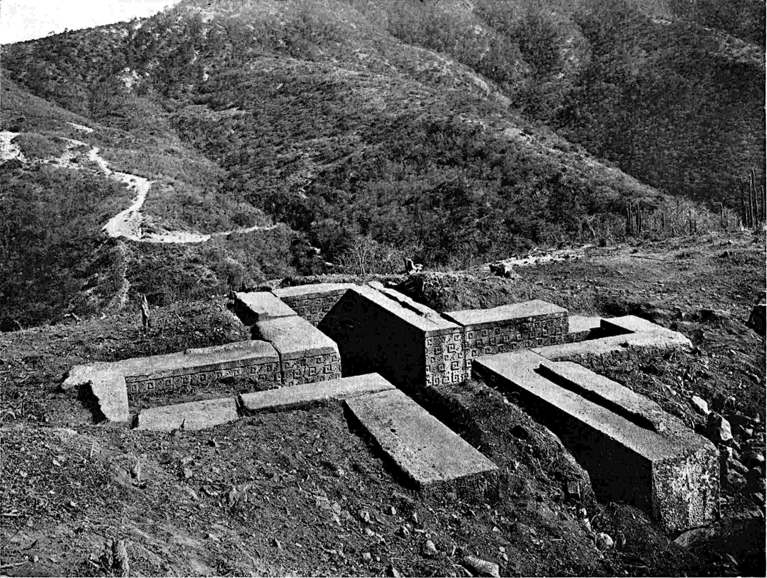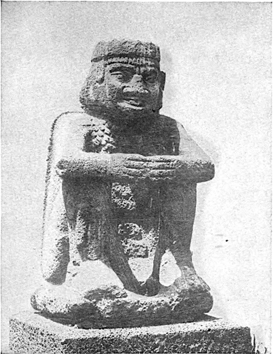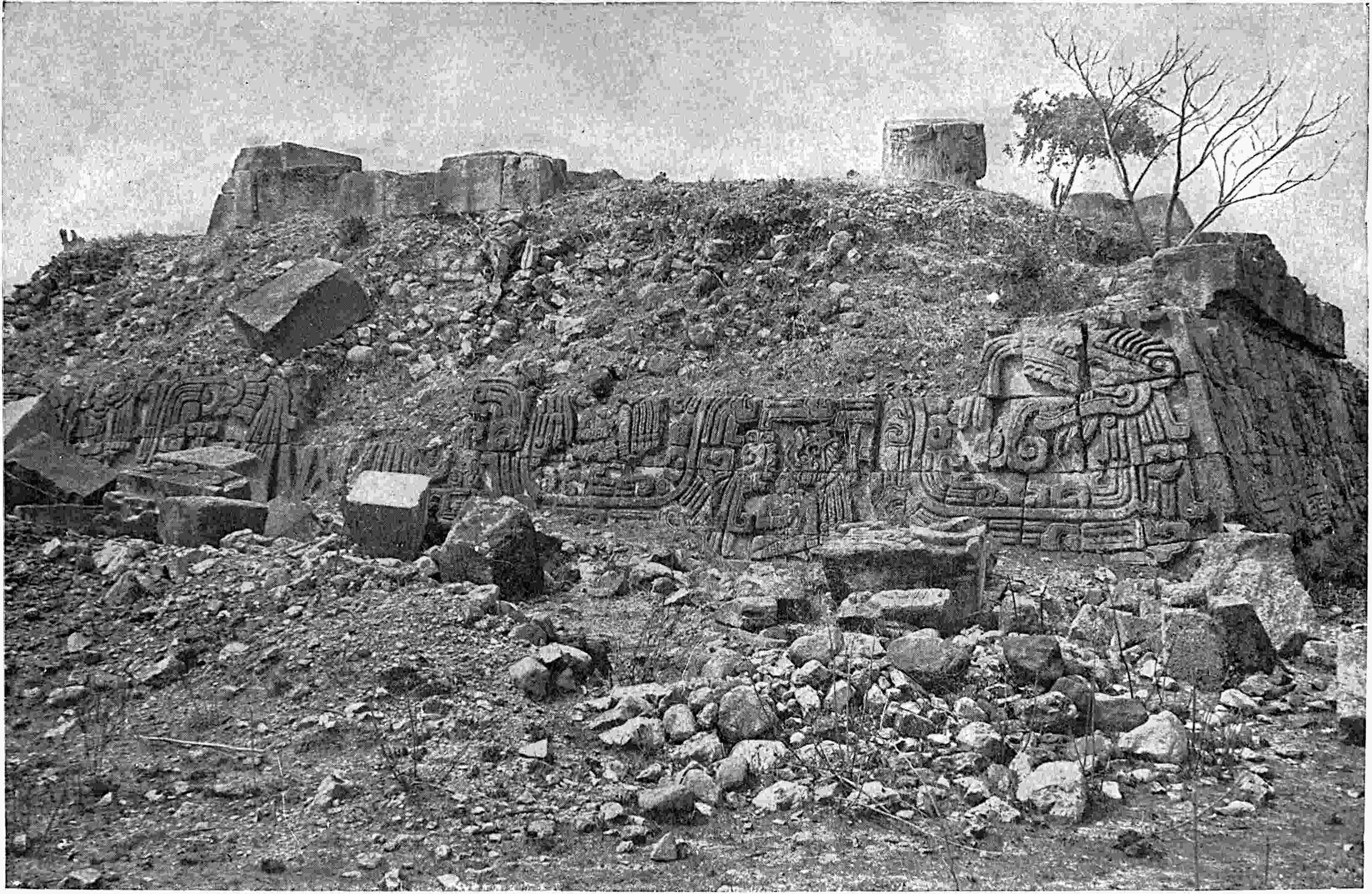 The excavation is shown that was made by Saville in January, 1900. A cement floor was uncovered and the base of a square that was probably a shrine. On the left, behind, is seen the top of the Catholic church that has been built on the site of one of the ancient structures. Excavations at the sites of old cities will doubtless yield valuable returns. Recently (October, 1900) a sewer excavation in the City of Mexico, near the Cathedral, the site of the great teocalli, furnished several wagon-loads of idols, gold objects, jade beads, etc. See also pages 209, 246