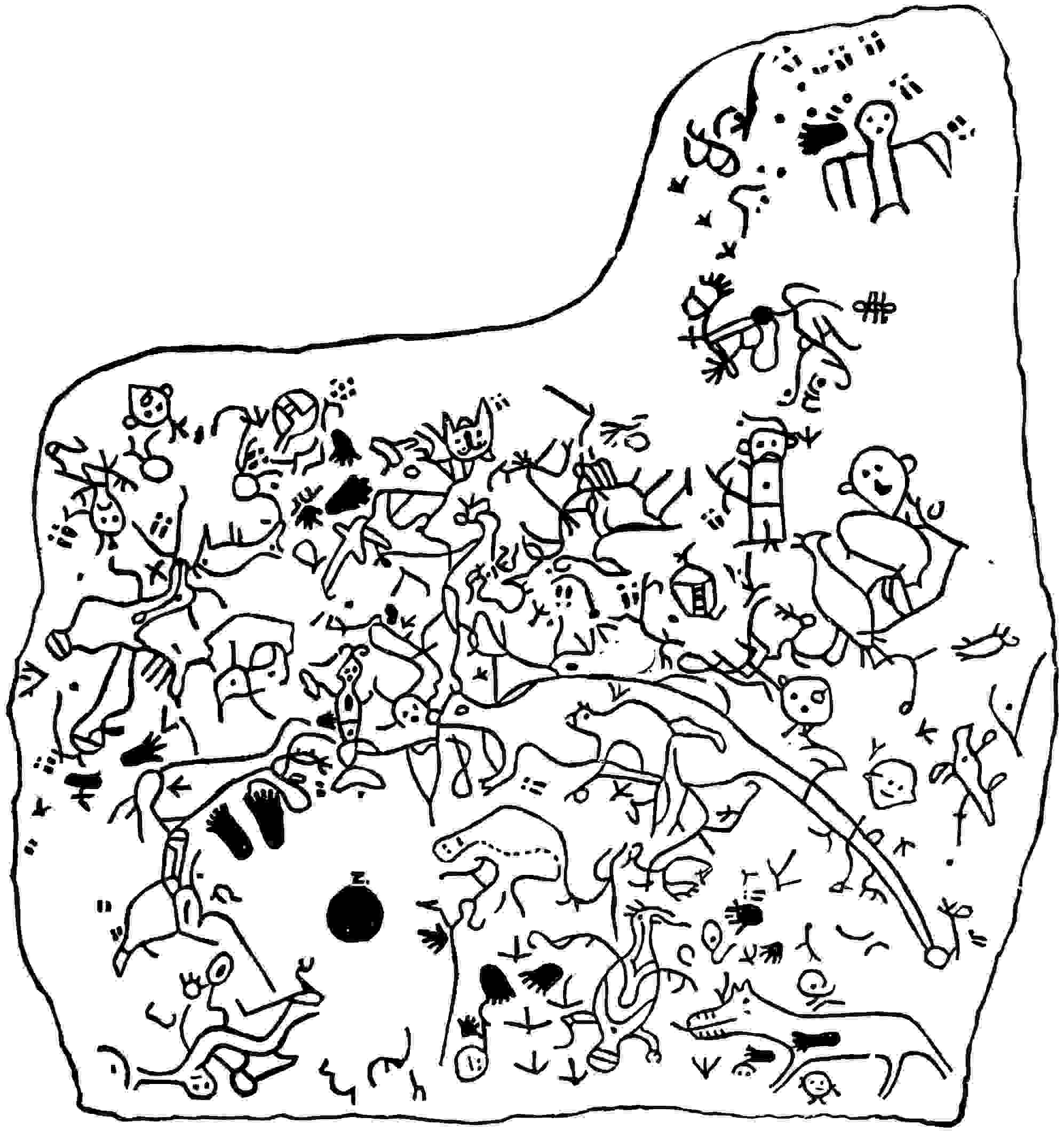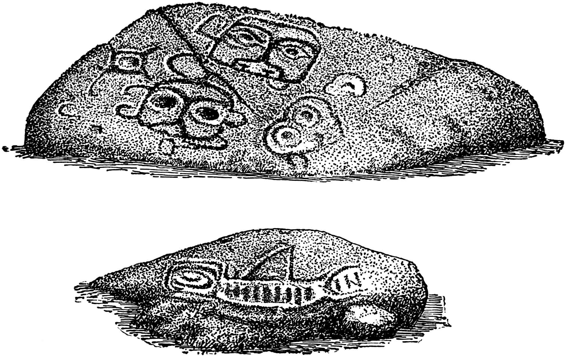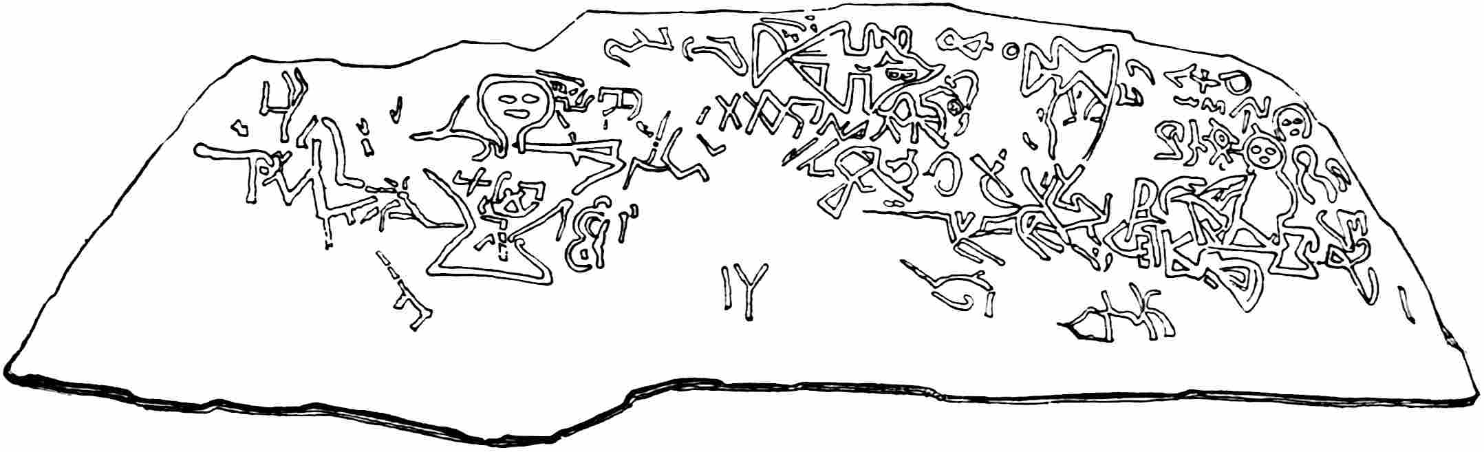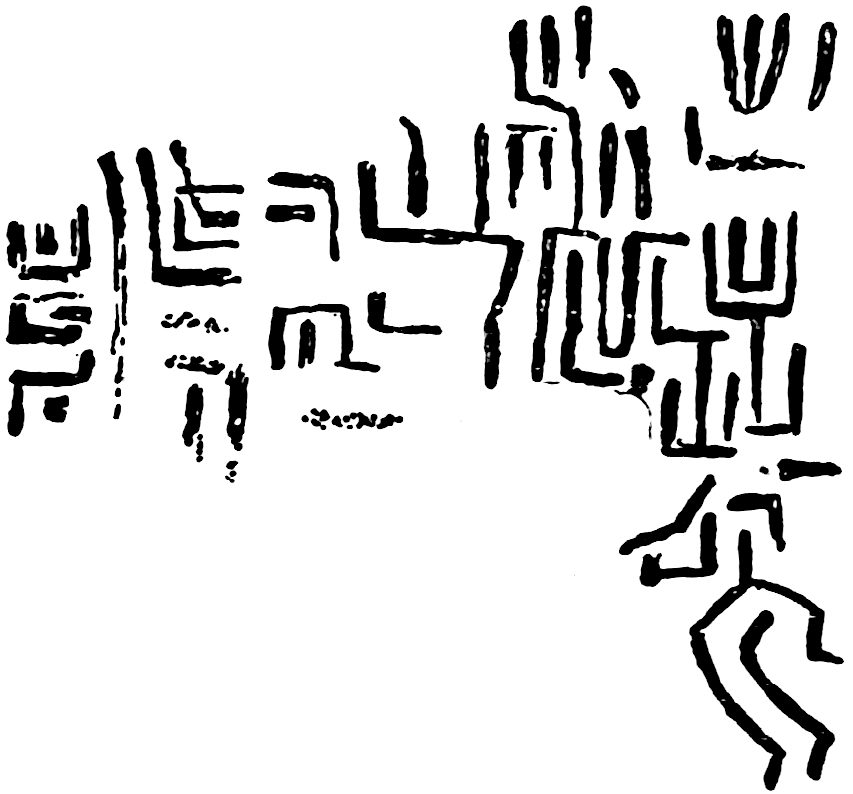 In the matter of writing, these races were moving toward success, and had their isolation been maintained they would in time have come to the full measure. As it was, the Mayas[38] had reached a considerable degree of efficiency, and the Aztecs were following close. The more northern stocks, however, had not passed beyond the elementary stage. In the sense in which artists now use the word “drawing,” it hardly existed anywhere on this continent; that is, there was little exactness and delicacy of delineation, but 42it was mainly an offhand representation of objects in a barbaric fashion. There was considerable merit in some of the work executed by the sculptors, but it was nevertheless as a whole aboriginal and primitive. In the middle region the drawings and rock peckings[39] have no artistic merit whatever, and are like the work of little children; nor are the Eskimo efforts much better. The Eastern States do not afford the same abundance of characters pecked and scratched, and sometimes painted on the rocks, that exists in the Rocky Mountain region, and particularly in the South-west, where they are found everywhere.[40] This may be due to the more verdant nature of the eastern part of the country, and also to the fact that the broad, smooth surfaces of sandstone exposed so universally in the South-west are generally absent in the East. Another reason may be that the Amerinds of the various43 Pueblo stocks and allied tribes were more given to inscribing the rocks in this manner. Certain it is that wherever evidences exist of the former occupation of a locality by Amerinds of the Pueblo kind, there rocks will be found covered with markings and paintings. These people went everywhere in their region, and they generally left some record on the rocks, as they do to-day. If one thinks he has found a place where they did not arrive in that vast land of cliffs and canyons, he is sure soon to be undeceived. Once I reached a little platform on the face of a cliff in Arizona by hard scrambling, part of the way through a narrow crevice, and as I stood viewing the valley a thousand feet below, 44I thought, “Now, at last, I am on a spot where the Shinumo[41] never stood.” As I turned to make my way down again I was confronted by a lot of pictographs spread across the whole of the smooth wall behind. Thus it was almost everywhere: in the deep gorges of the Colorado River, in its side canyons, in the cliffs above and around, and all along Green River, at least as far north as the lower end of Split-Mountain canyon, these pictures occur. The climate is dry, and there is little change from one century’s end to another.[42] Some are comparatively recent, while others, even some of the painted ones, are old; how old it is impossible to estimate, but many of them are found in regions where no Amerinds of the Pueblo type[43] have lived within historical times, or within the memory of those Amerinds who now occupy the region. Some of the painted figures in sheltered places appeared fresh, but they must have been at least a century or two old. The other Amerinds, while they also executed picture-writings of various kinds, did not so often decorate rock surfaces with them. They were more inclined to drawing and painting on buffalo robes and other 45skins, on bark, on trees, shell, pottery; even the human form in some regions not being exempt. The Puebloans, while utilising most of these methods, also used the rocks a great deal, the country they occupied abounding in broad, smooth faces attractive for this purpose. In the settled East the perishable substances have long ago disappeared, except those fortunately preserved in museums or private collections. Comparatively few rock inscriptions are found there, and these have created considerable discussion and the usual number of theories. The markings, undoubtedly Algonquian, on the now widely known Dighton Rock in Massachusetts were for a long time ascribed to the Northmen, and were copied in a great many different ways.[44] The trouble arose from the same reason that has led to so many mistaken theories regarding the Amerind race—that is, an underestimate of their intellectual side, so far as those north of Mexico are concerned, and an overestimate of those in the latter region. Brinton asserts that 47the Algonquins had developed the picture-writing farther than any other stock north of the Aztecs. “It had passed,” he says, “from the representative to the symbolic stage, and was extensively employed to preserve the national history and rites of the secret societies. The figures were scratched or painted on pieces of bark or slabs of wood, and as the colour of the paint was red, these were sometimes called ‘red sticks.’” Some of these slabs, or “red sticks,” like the Walam Olum (walam = painted, and olum = scores or notches on a stick) of the Lenapés,[45] have been preserved. Many of the figures executed by the Amerinds, not excepting the Aztecs and the Mayas, were grotesque, and even childish. Their strangeness is frequently due to our unfamiliarity with the originals, figures with queer hair-dressing, masks, or complete ceremonial costume, which, if we could see them to-day, would resemble nothing we had ever imagined or viewed before. The extraordinary make-up of these people for their ceremonials is beyond anything our race can imagine. Those who have witnessed Pueblo ceremonials will understand how unlike any human being the wearer of the strange costumes can become. The katcina[46] is fearfully and wonderfully made, and, especially if represented with the half-skill 48of the Amerind, would baffle classification by anyone not familiar with the actual object. Among the early tribes there were undoubtedly many of these ceremonial dresses and costumes that we can now have no conception of, and where we see them represented in sculpture or drawing they have a most uncanny and diabolical appearance. Even to-day were we to see a re