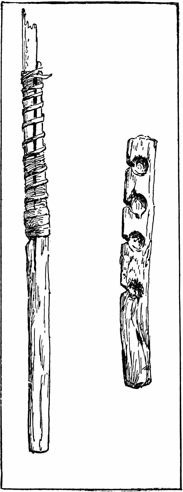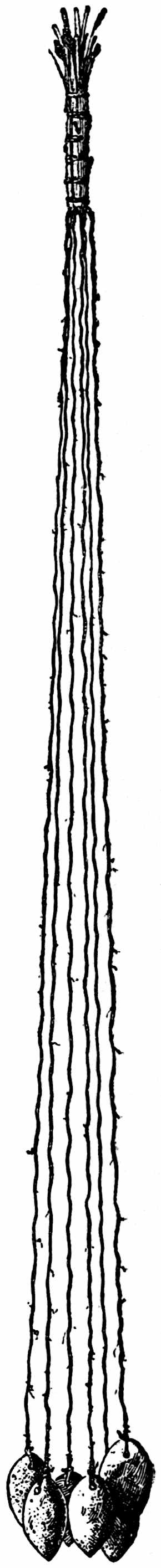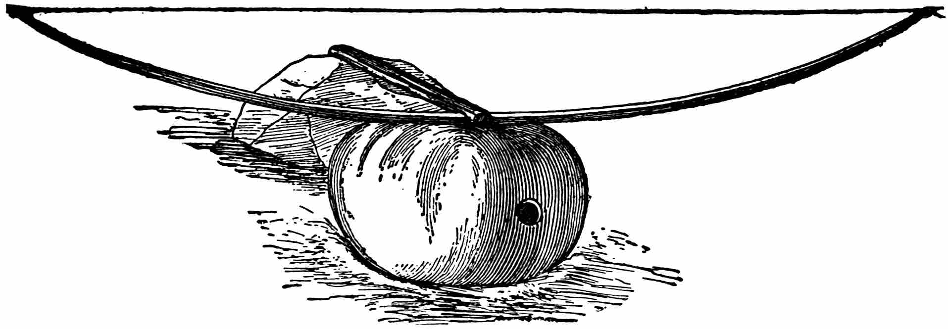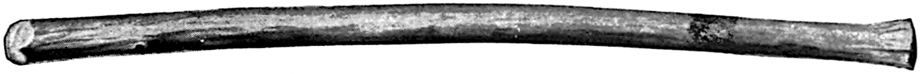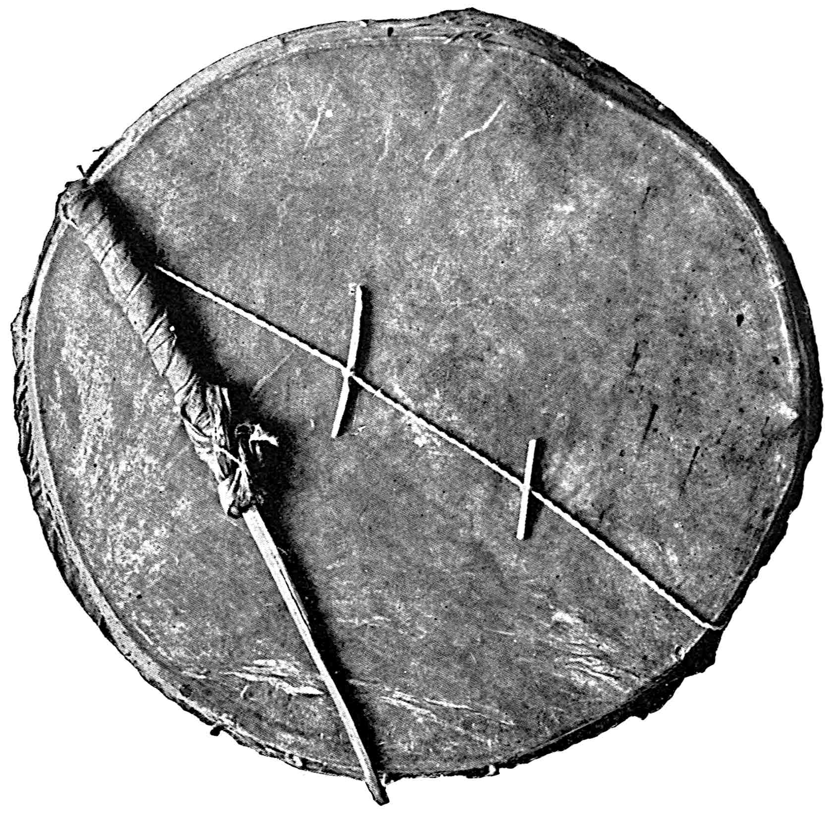 The sounding-board is a gourd with a hole in it. The other end of the brace attached to the bow rests on a stone. The cord of the bow was struck by a stick to produce the desired noise. Found by Lumholtz in use. Length of bow, 1 metre 36.5 centimetres. See page 308; and also article on “Geographical Distribution of the Musical Bow” by O. T. Mason, American Anthropologist, November, 1897; Natural History of the Musical Bow, by Henry Balfour; and “Symbolism of the Huichol Indians,” by Carl Lumholtz, Memoirs of the American Museum, vol. iii, pages 206, 207