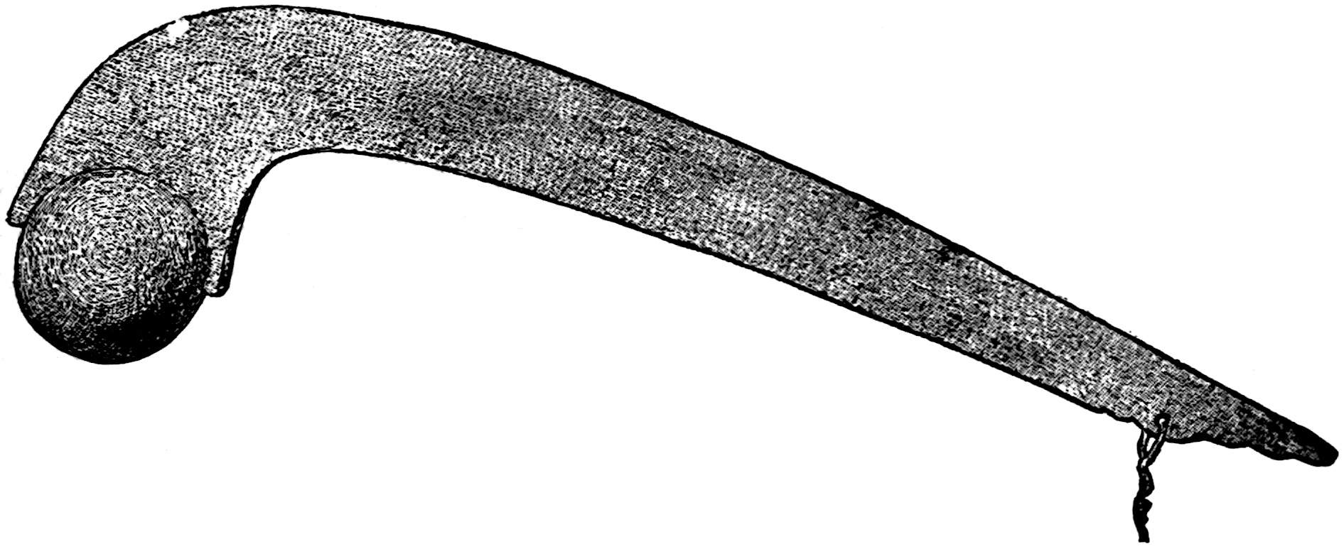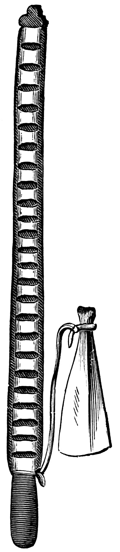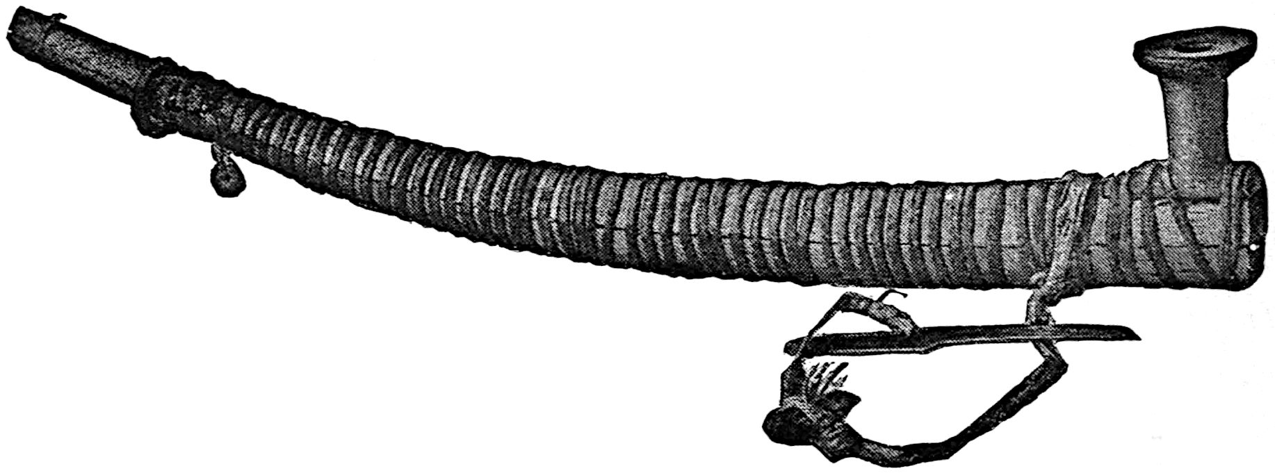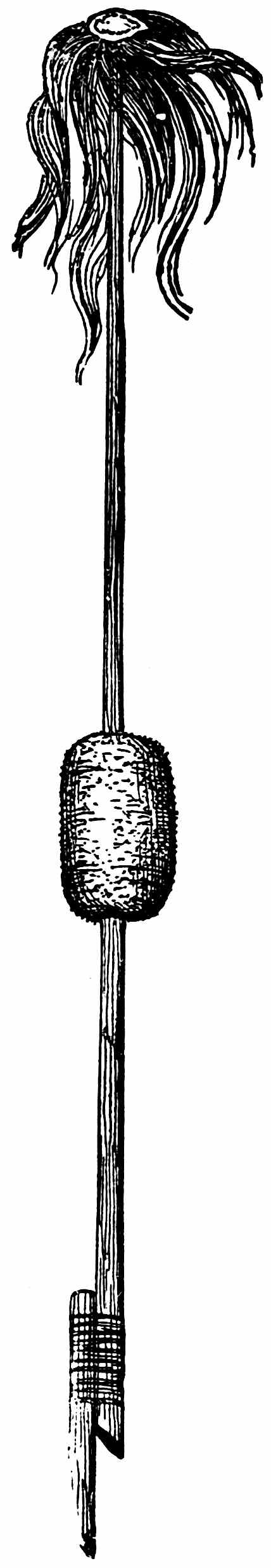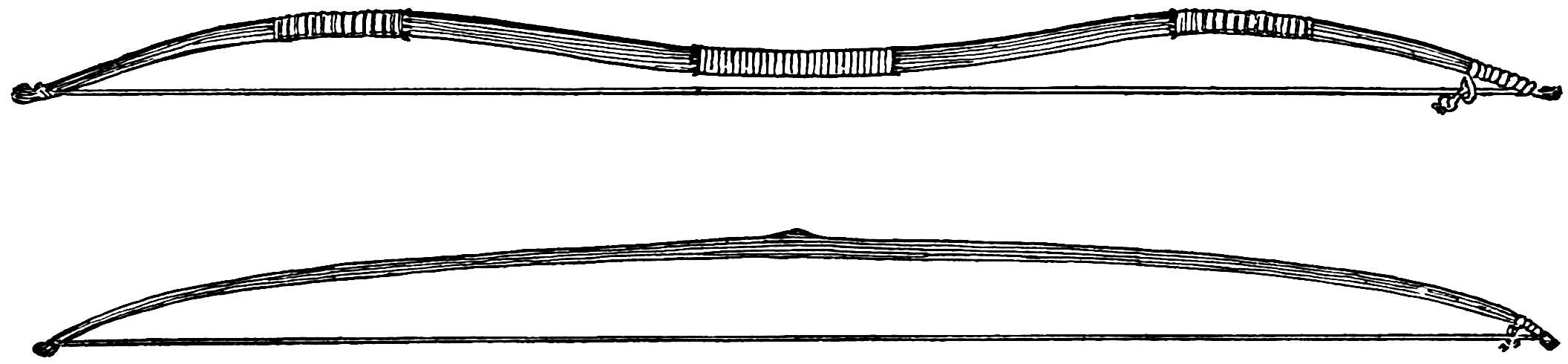 The sounding-board is a gourd with a hole in it. The other end of the brace attached to the bow rests on a stone. The cord of the bow was struck by a stick to produce the desired noise. Found by Lumholtz in use. Length of bow, 1 metre 36.5 centimetres. See page 308; and also article on “Geographical Distribution of the Musical Bow” by O. T. Mason, American Anthropologist, November, 1897; Natural History of the Musical Bow, by Henry Balfour; and “Symbolism of the Huichol Indians,” by Carl Lumholtz, Memoirs of the American Museum, vol. iii, pages 206, 207
